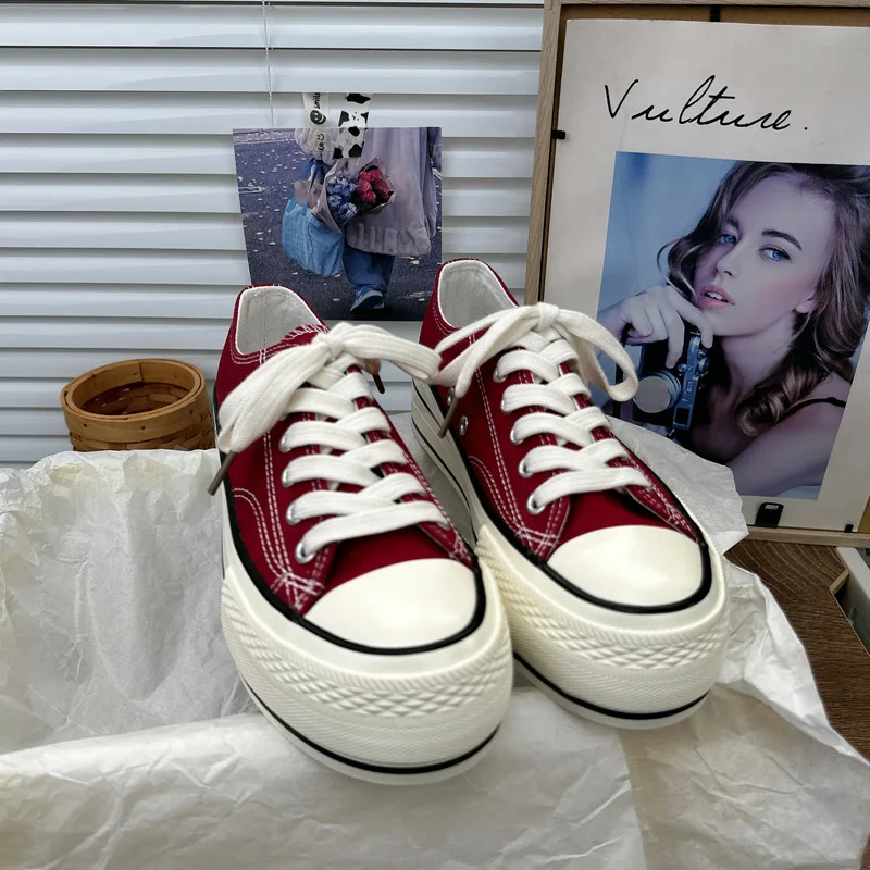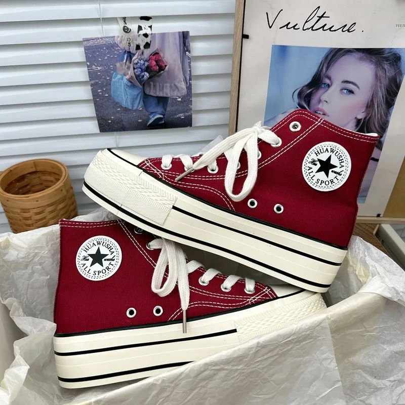 2024 New Style Korean Versatilewine Red High Top Shiny Canva Women's Shoes With Thick Sole 4CM Low Top Sneaker H-1