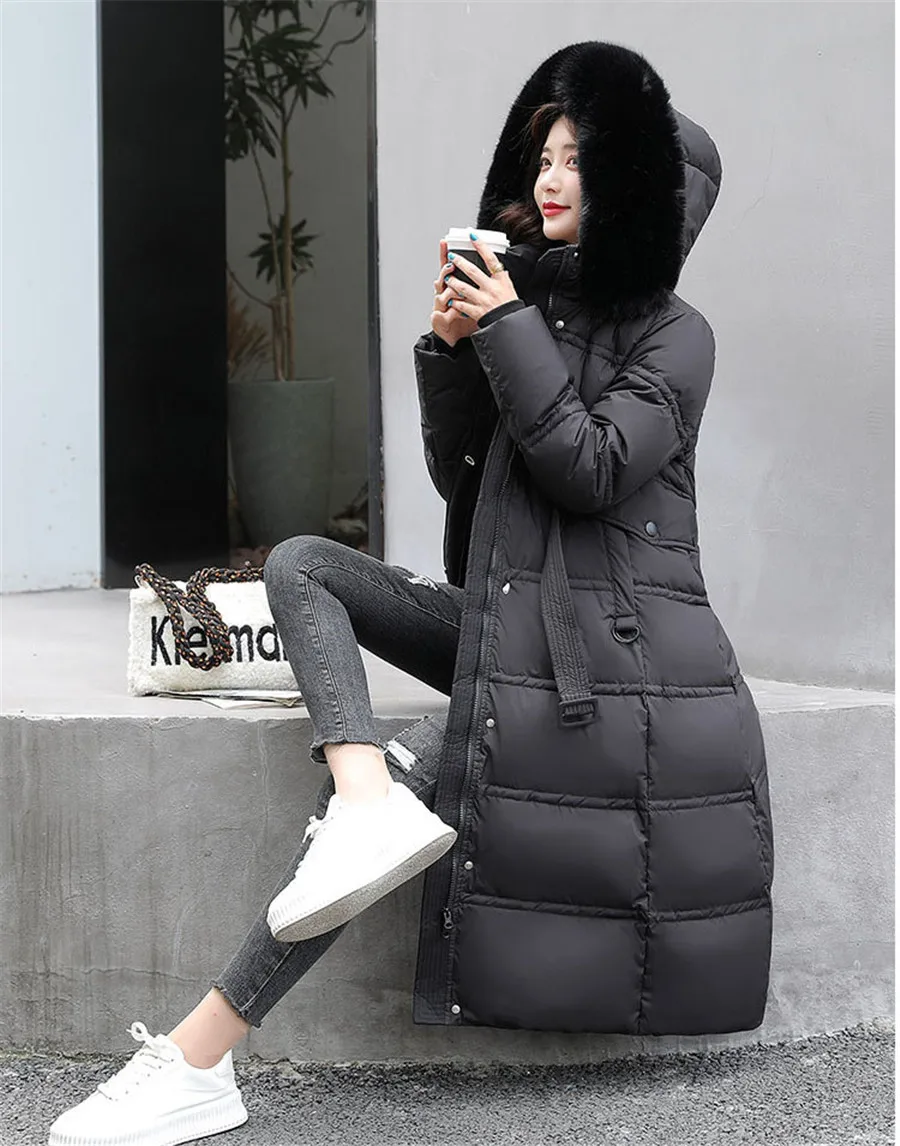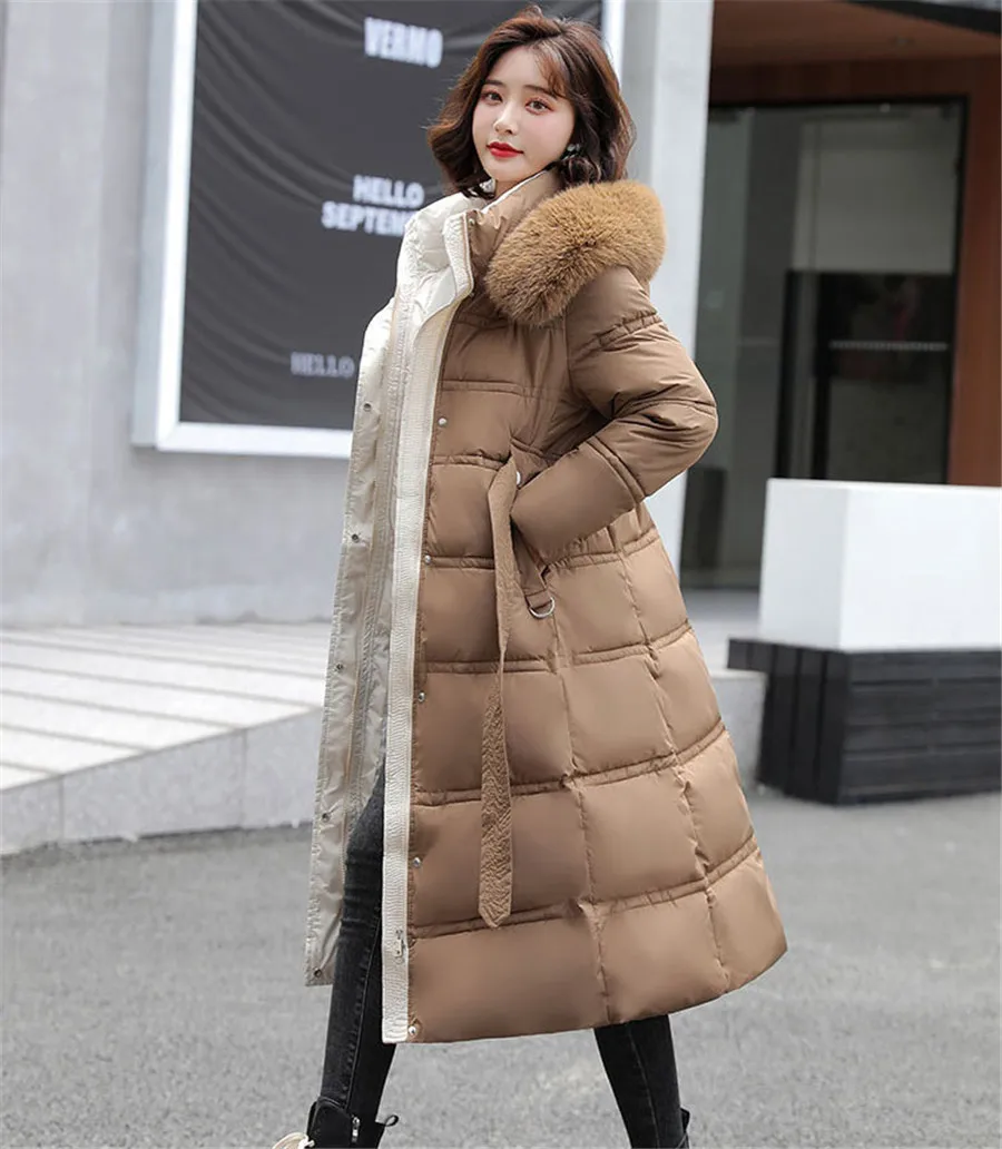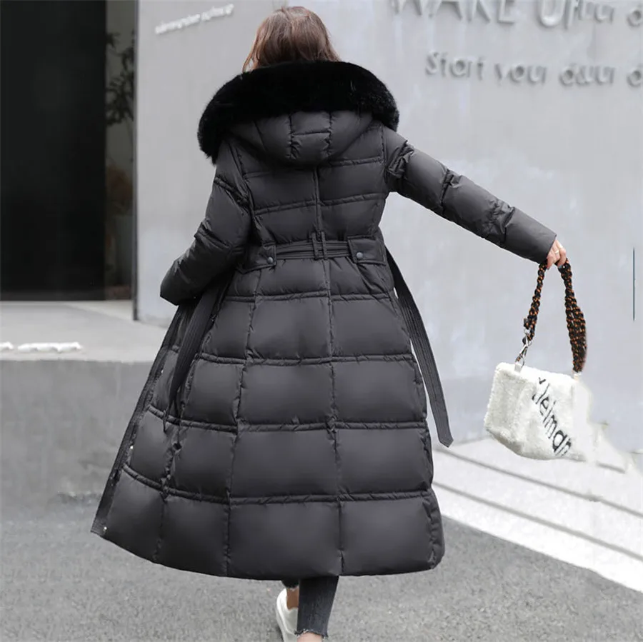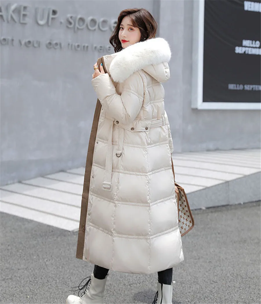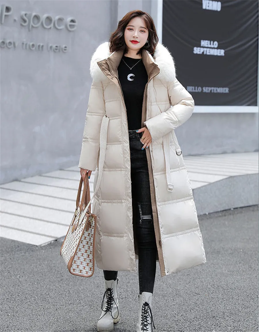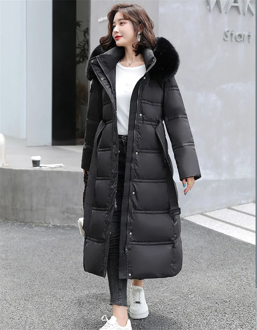 90% White Duck Down Thick Warmth Elegant Hooded Fur Collar Large Size Loose Female Coat Long sleeve solid color pocket zipper belt length Women Winter Down Jacket