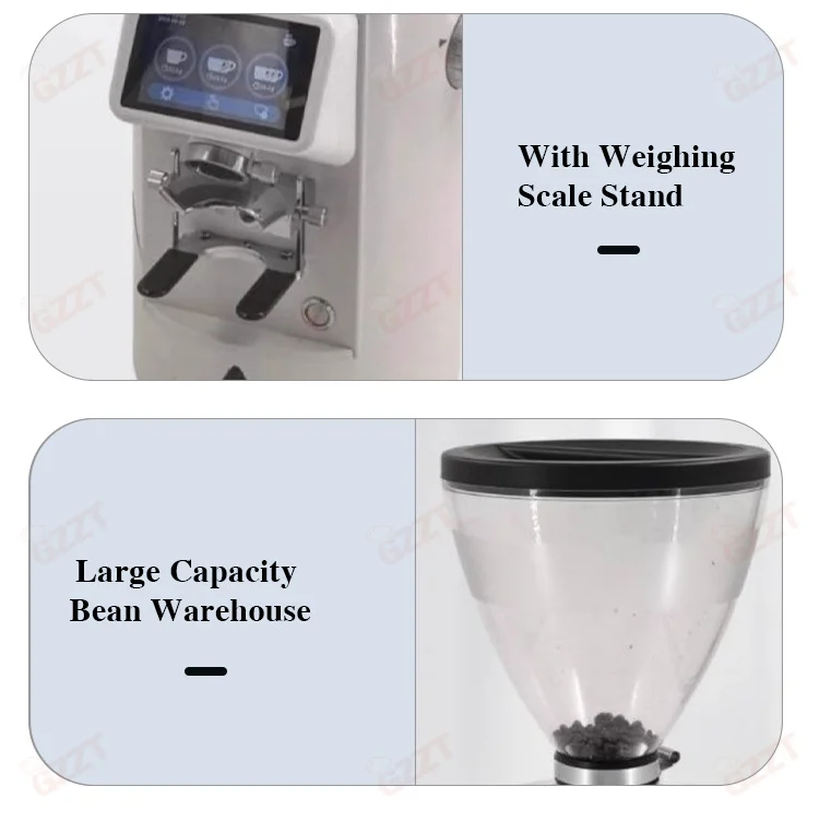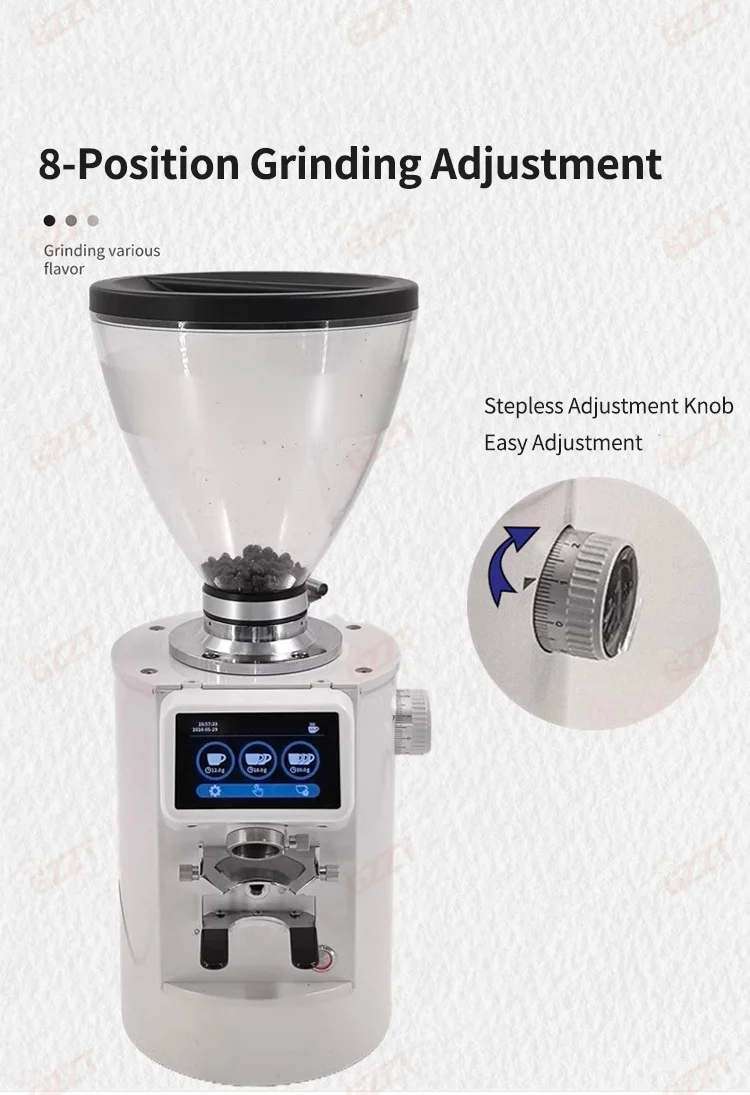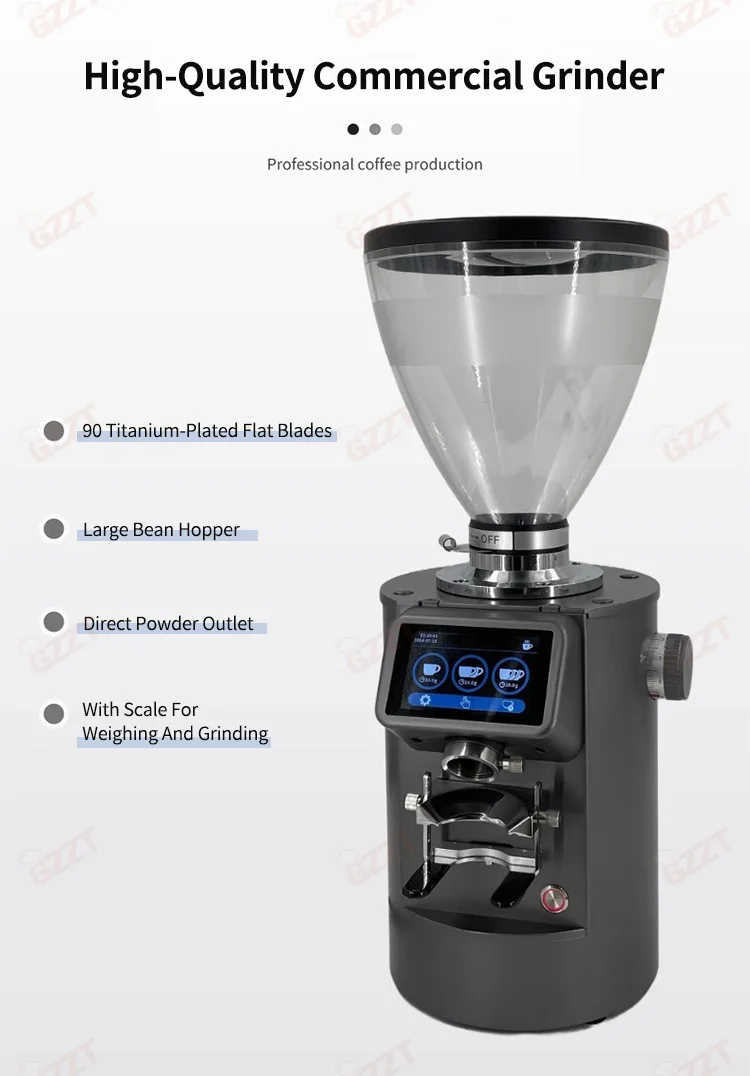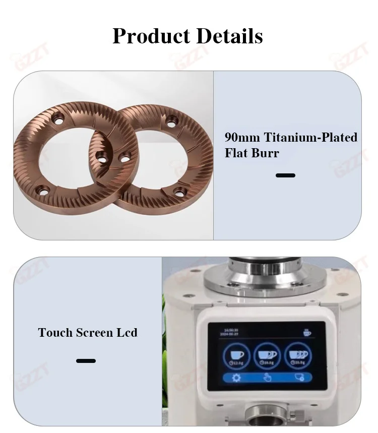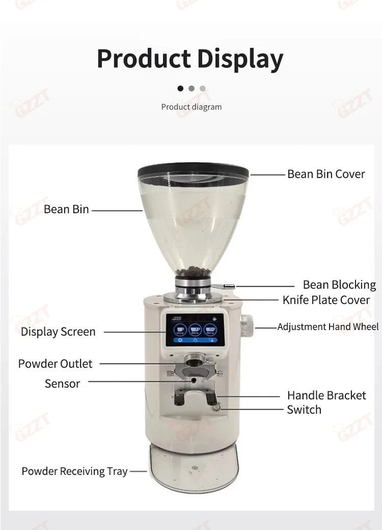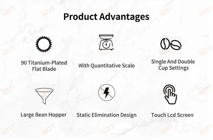 1.8-Position Grinding Adjustment. Subdivide Stepless Adjustment, Meeting different flavor needs. 2.90mm Titanium-Plated Flat burrs, Powerful, fast grinding, continuous production. 3.With Quantitative Scale Bracket,Quantitative grinding. Grinding time and weight can be freely controlled, more convenient. 4.Anti static design. prevent splashing, less clumping. 5.3.5 lbs large capacity bean bin, transparent and visible. 6.LED control panel, simple operation. 7.Single / double / triple cup settings