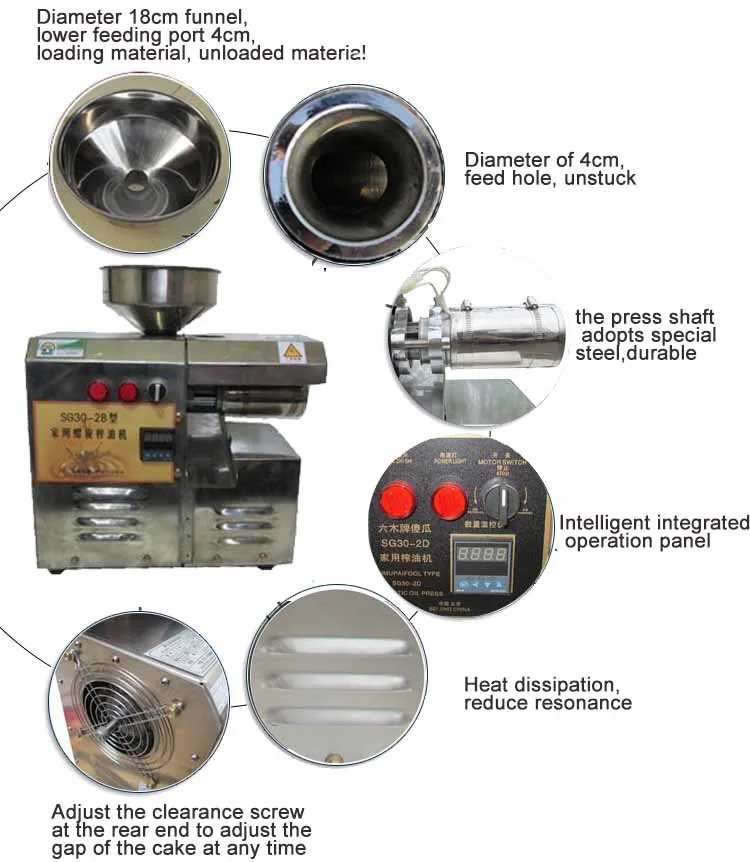 10.the oil seam size adjustable, squeezed peanut big mouth. Do not return oil, sesame, small mouth. Slag free.