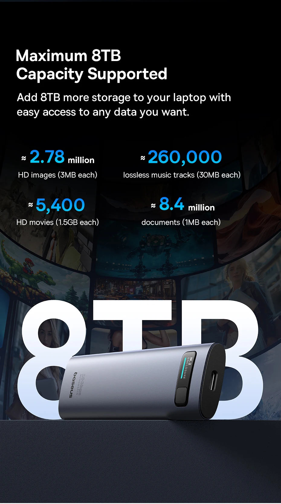 Add 8TB more storage to your laptop with easy access to any data you want.