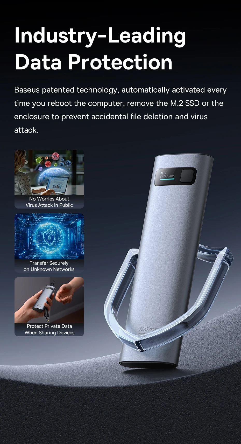 Baseus patented technology, automatically activated every time you reboot the computer, remove the M.2 SSD or the enclosure to prevent accidental file deletion and virus attack.