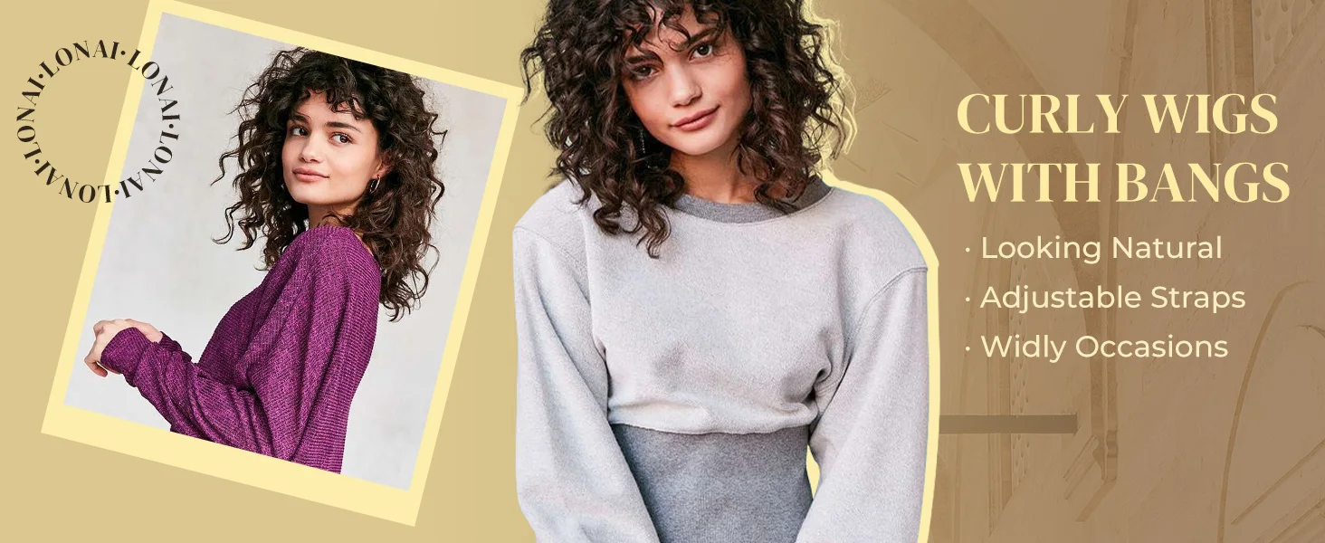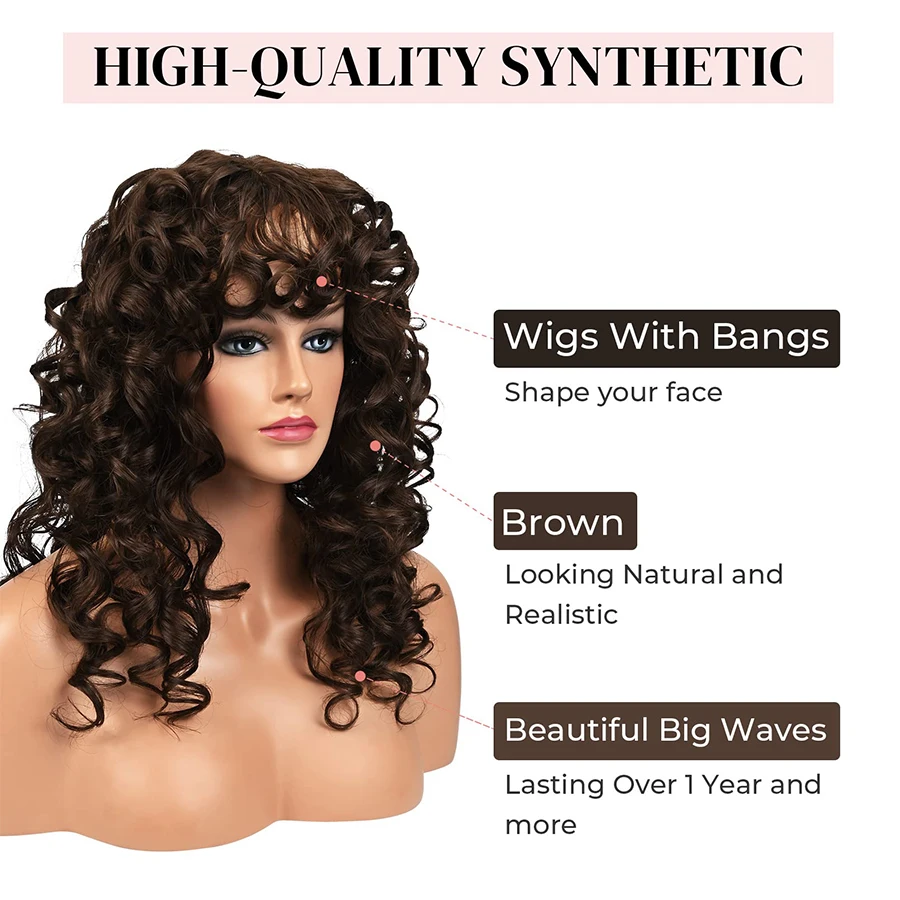 Curly Wig with Bangs for Women Long 16Inch Kinky Wigs with Wispy Bangs for Daily Use Party Cosplay-Chocolate Brown