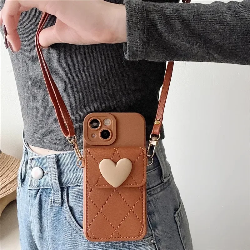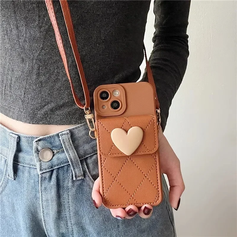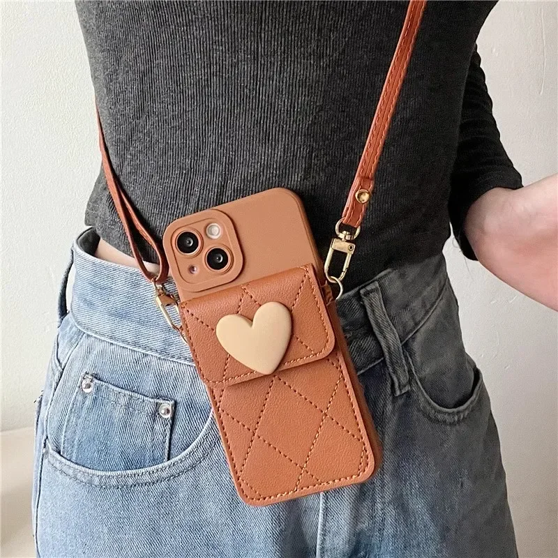 Cute Crossbody Lanyard Case For Xiaomi Redmi Note 14 Pro Plus 13 12 14C 13C Mi 14T X7 Strap Card Slots Phone 3D Love Heart Cover