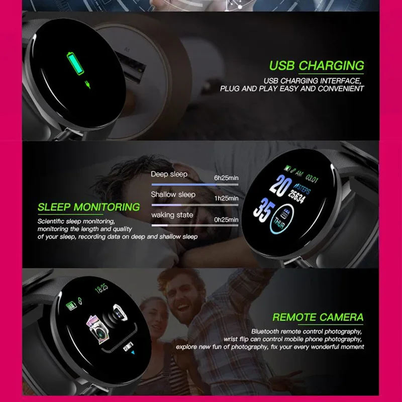 D18 Smart Watch Heart Rate Monitor Men's Women's Smartwatch Round Fitness Digital Watches for Men Women Band Bracelet PK D20 Y68
