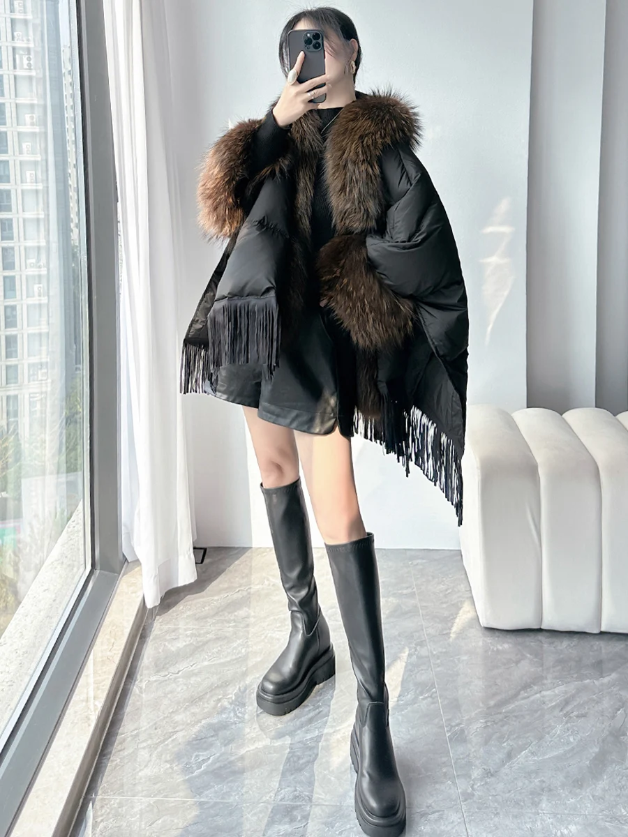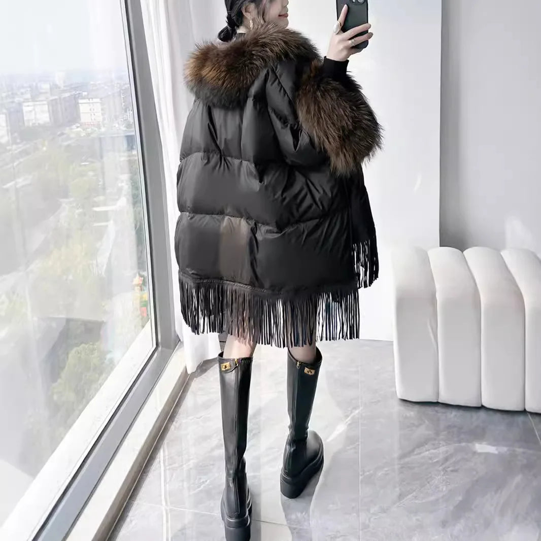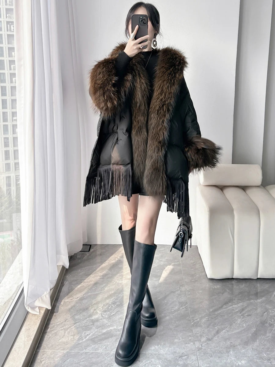 Down jacket for women in winter 2024, new cloak, oversized fur collar, medium to long loose white duck down jacket