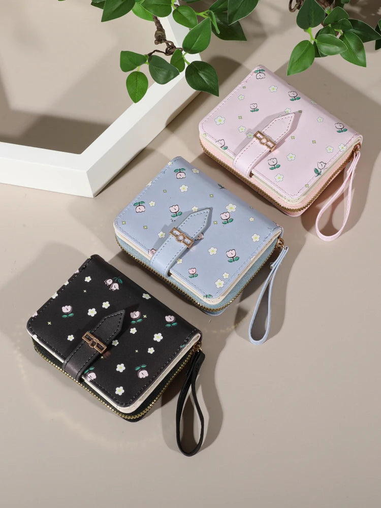Flower patterned credit card holder for women or men's small card case with zipper hand-held wallet