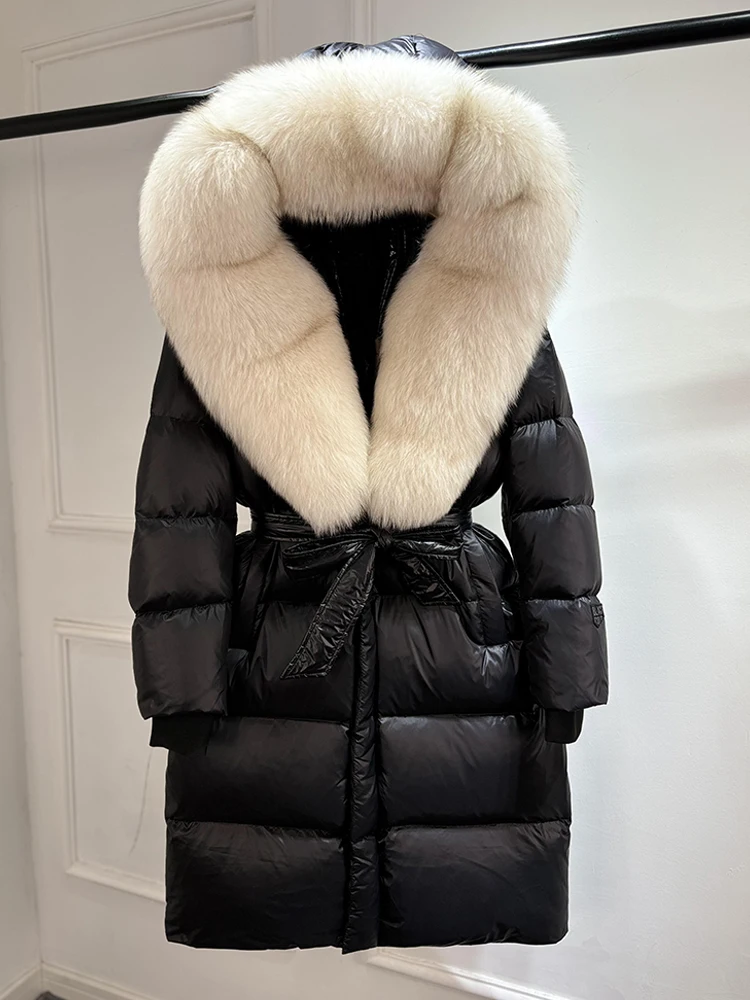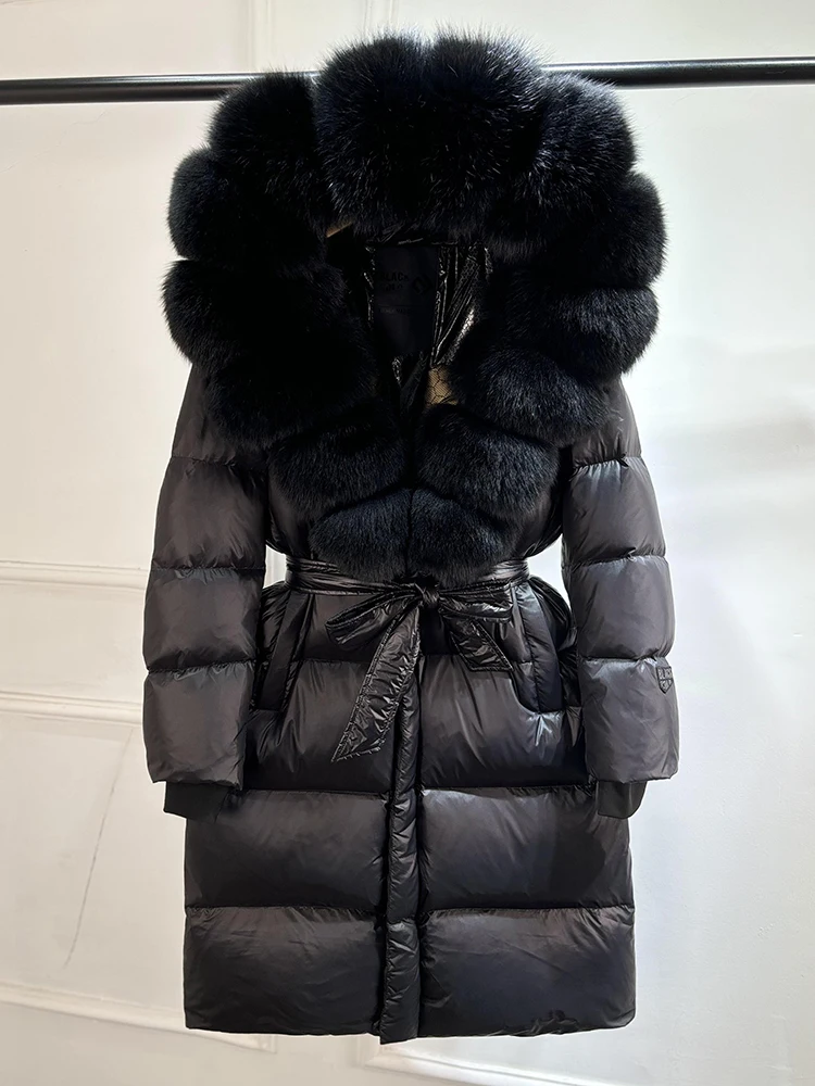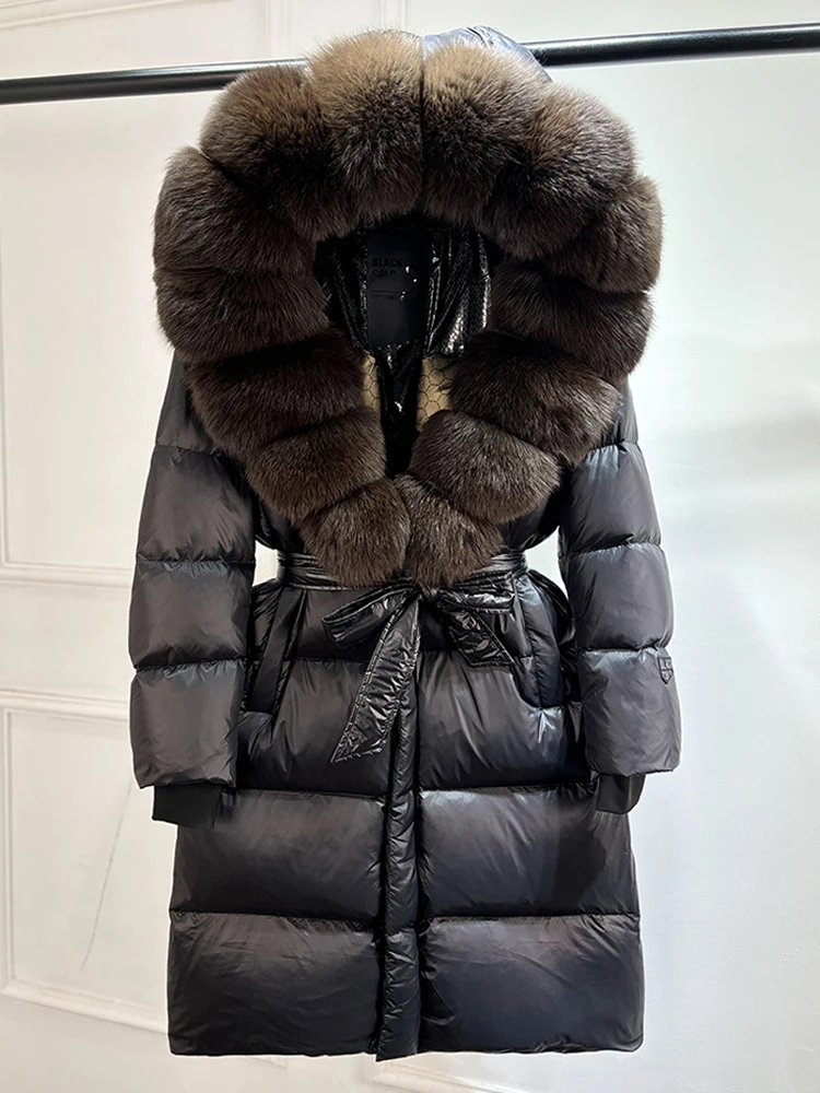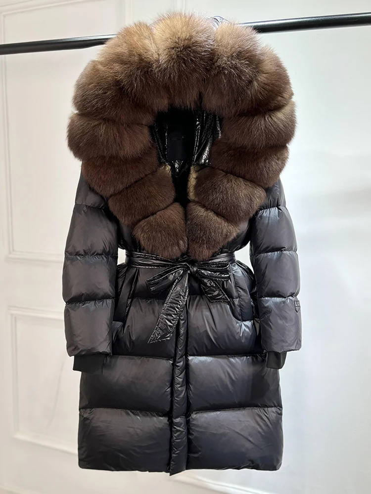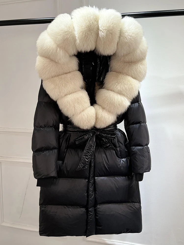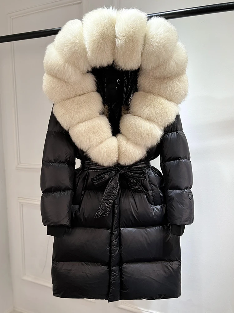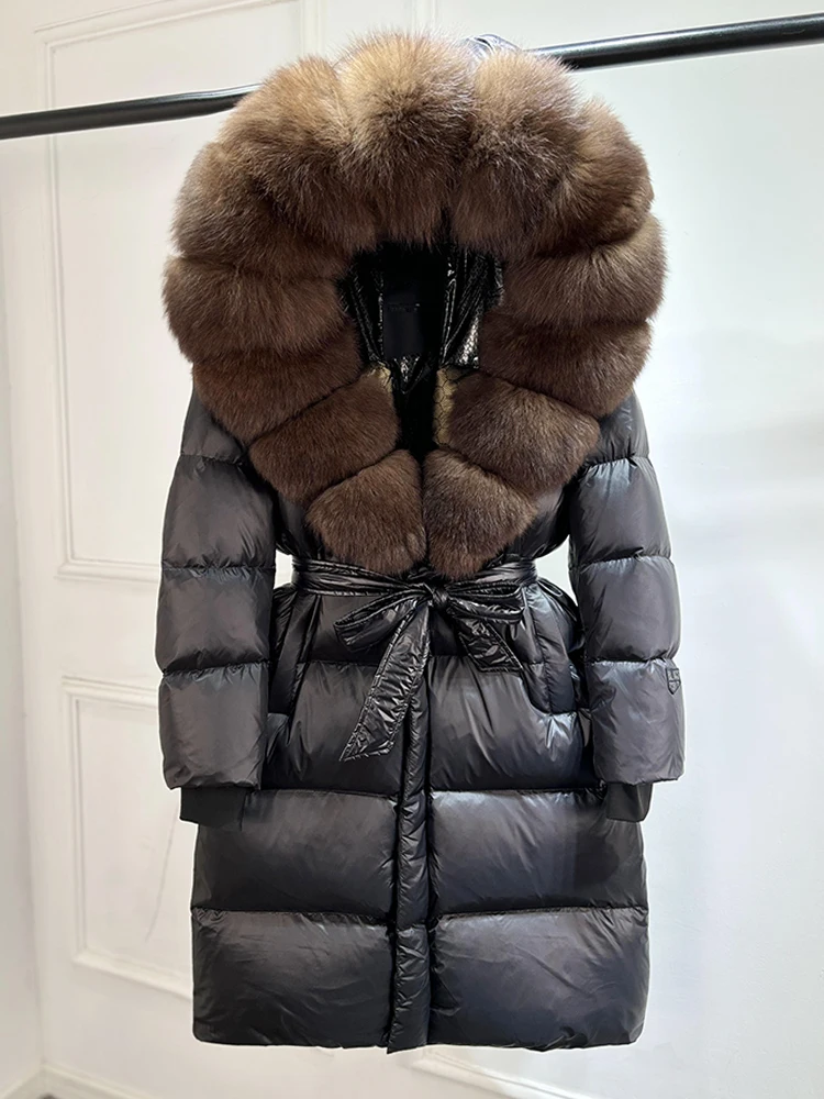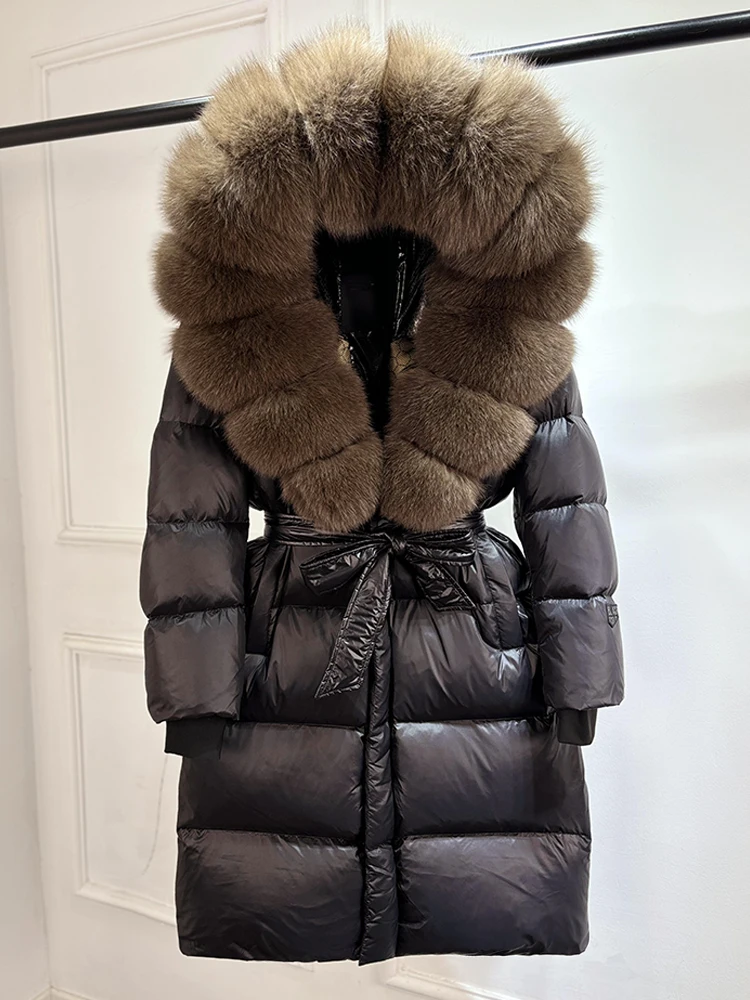 Janveny Winter Real Natural Fox Fur Hooded Long Puffer Down Jacket Women 90% Goose Down Coat Thick Warm Female Shiny Parkas