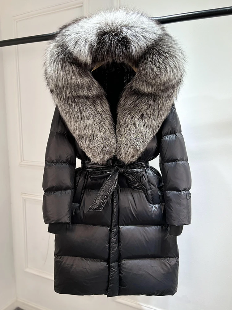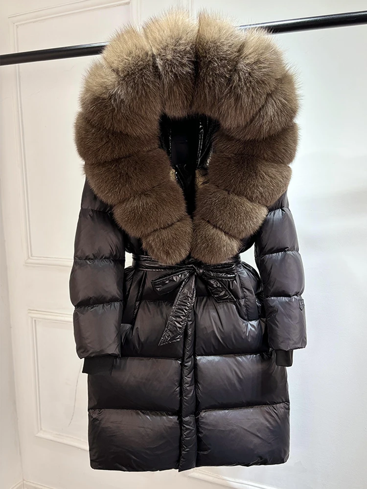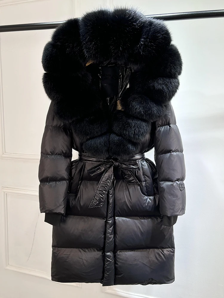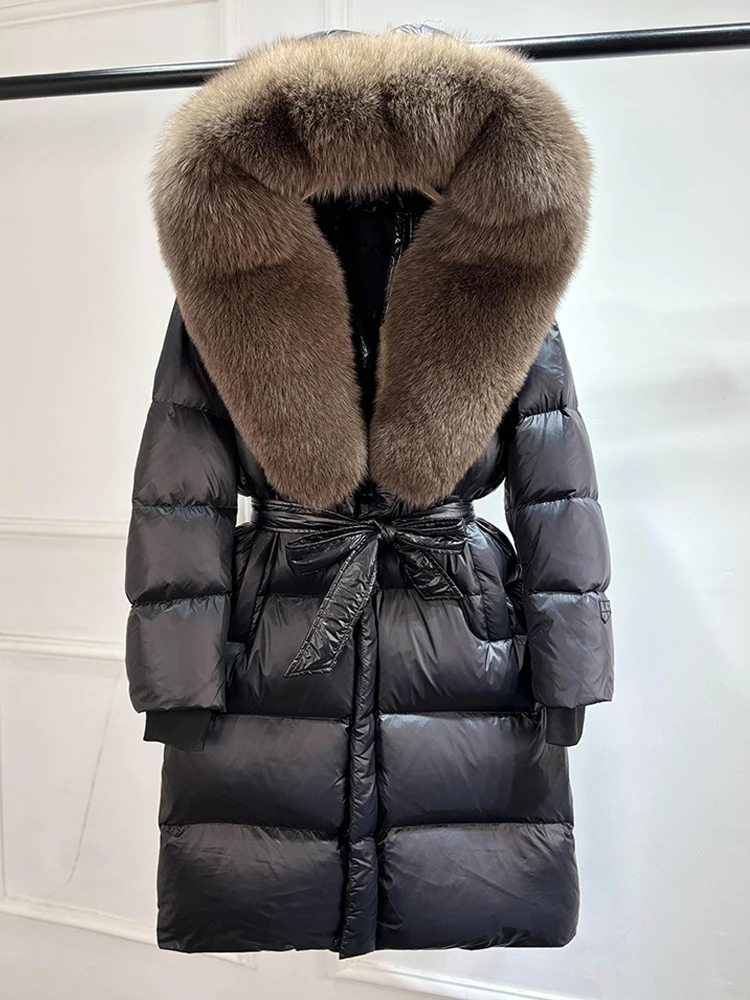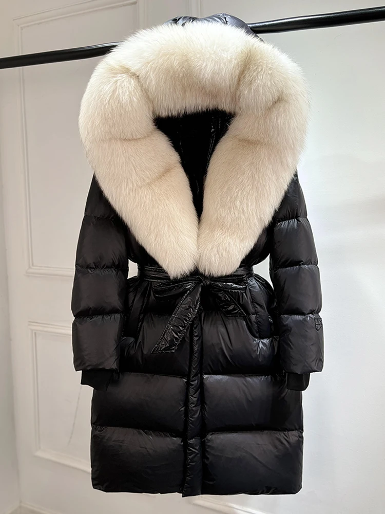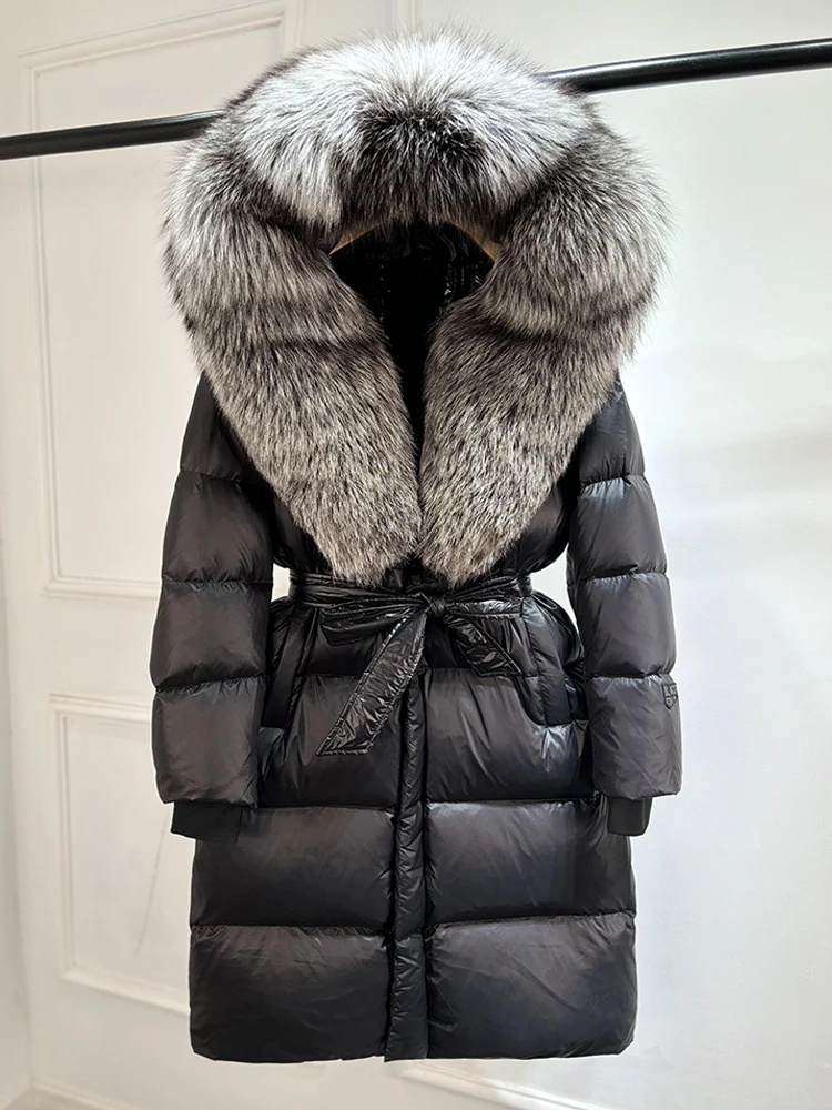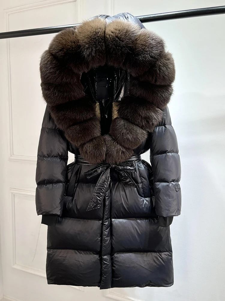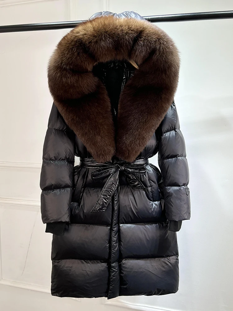 Janveny Winter Real Natural Fox Fur Hooded Long Puffer Down Jacket Women 90% Goose Down Coat Thick Warm Female Shiny Parkas