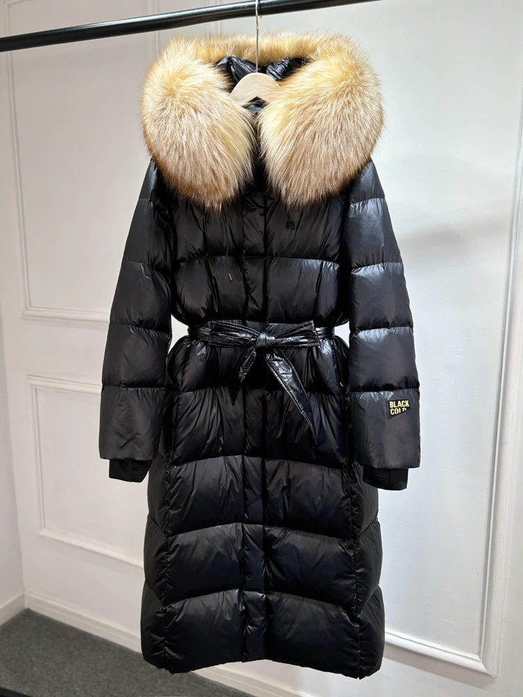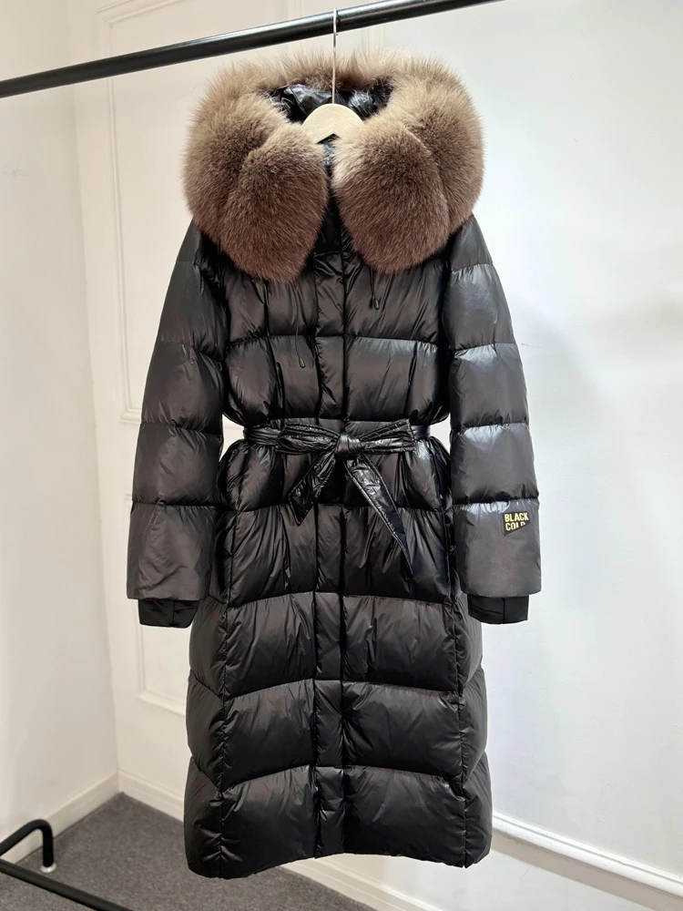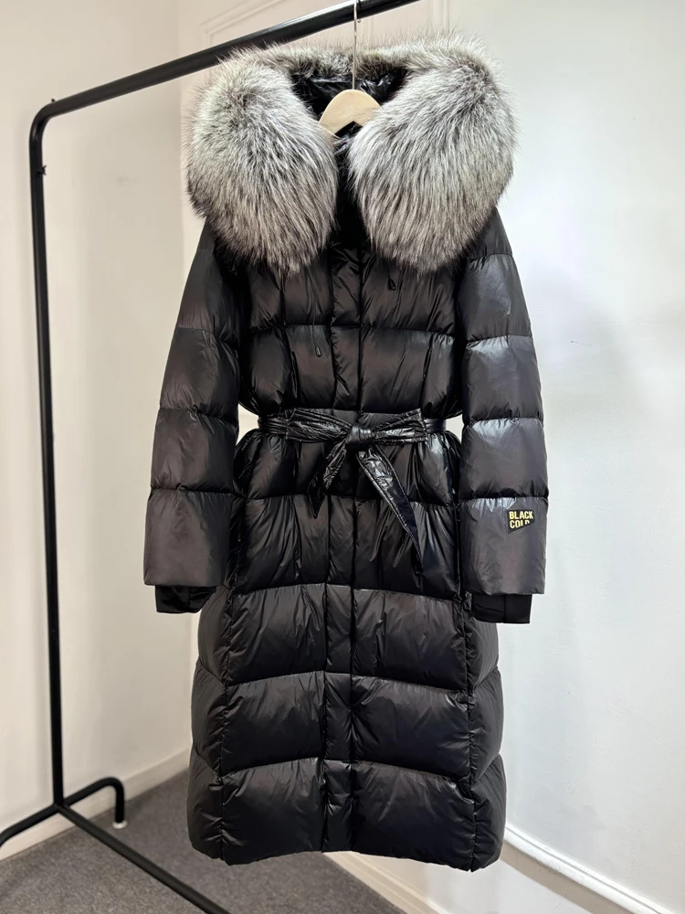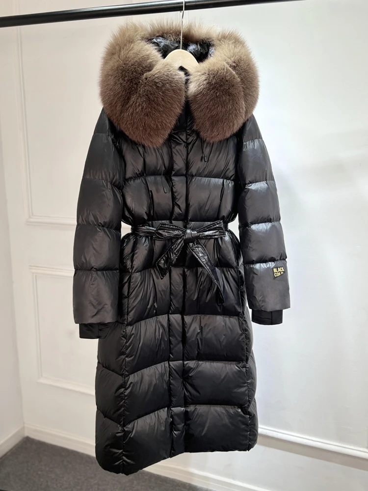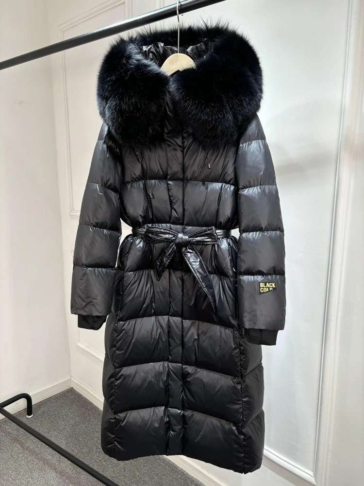 Janveny X-long Shiny Puffer Jacket Women Hooded Winter Thick Goose Down Coat Belt Large Natural Fox Fur Female Parkas Waterproof