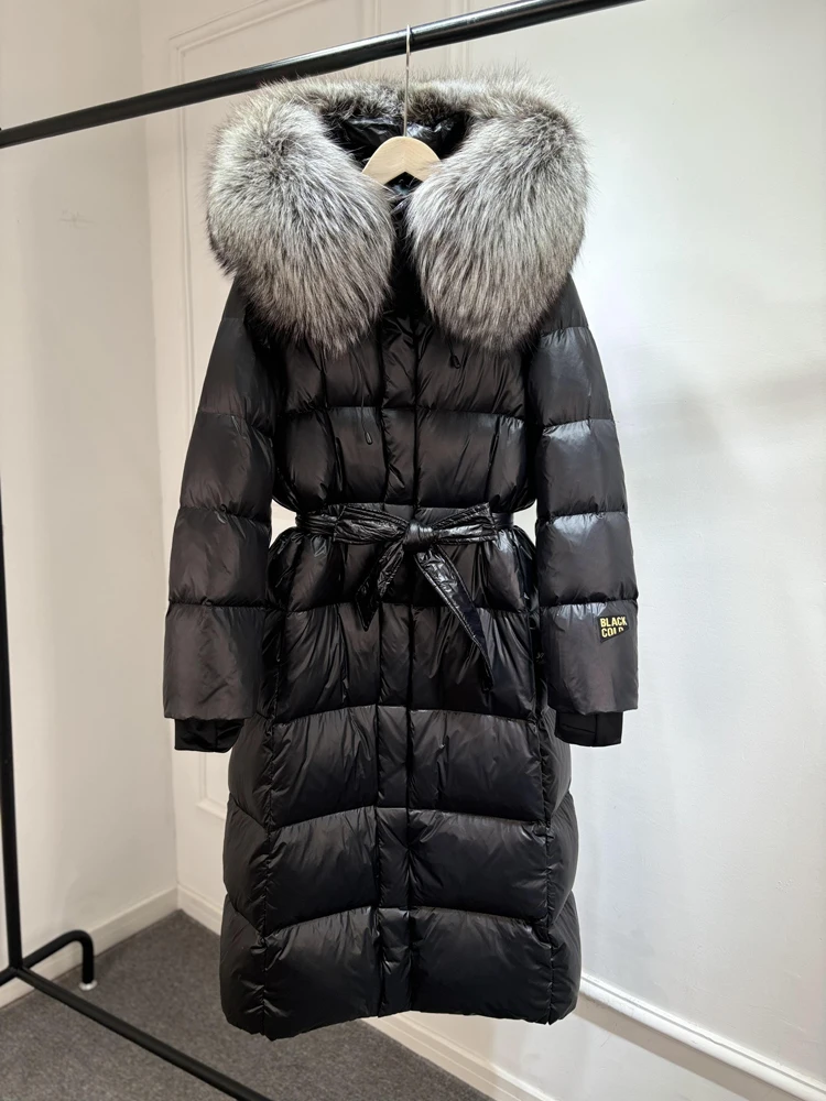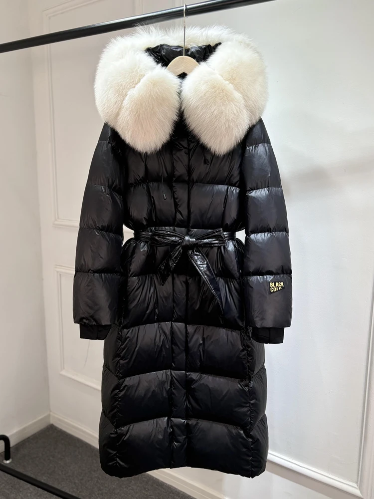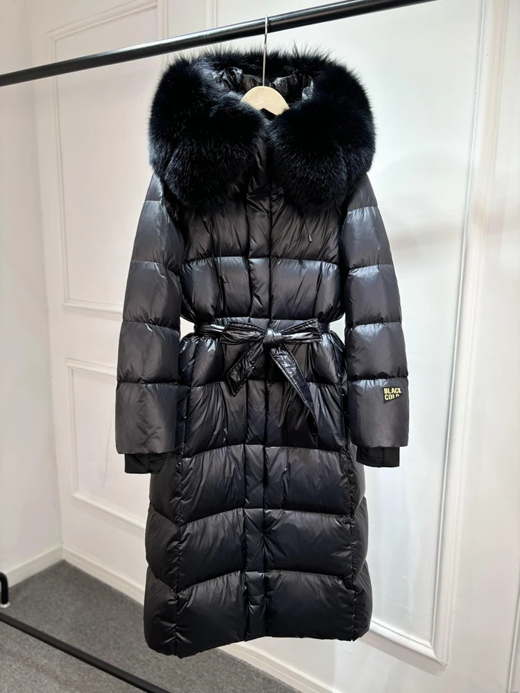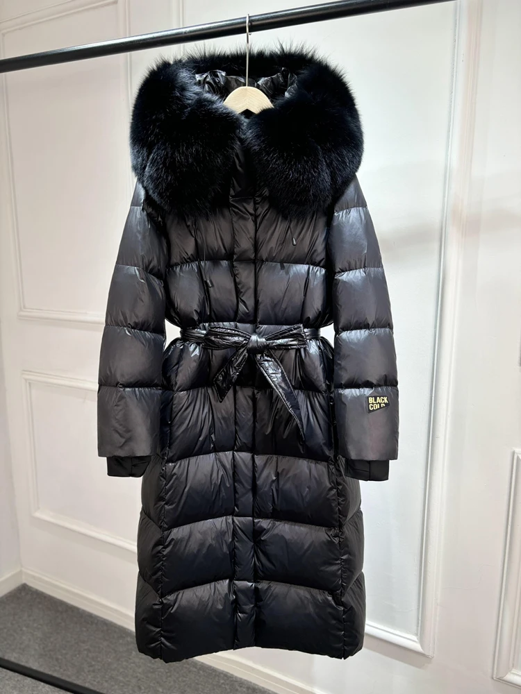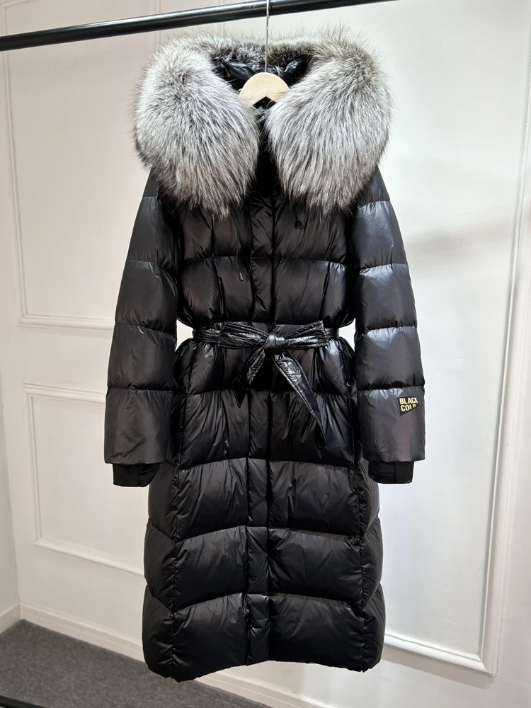 Janveny X-long Shiny Puffer Jacket Women Hooded Winter Thick Goose Down Coat Belt Large Natural Fox Fur Female Parkas Waterproof