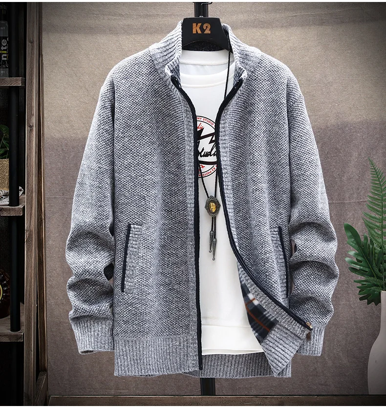 Knitted Cardigan Solid Color Sweater Men Zipper Autumn New Long-sleeved Jacket Warm Fleece Cardigans Jacket