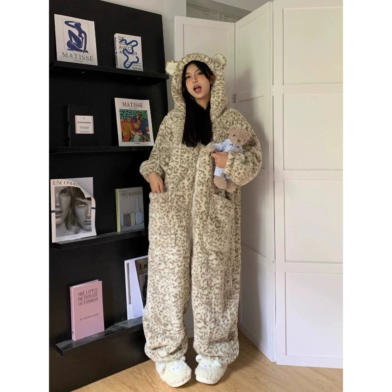 Leopard Hooded Pajamas Animal Kigurumi Unicorn Adult Onesies for Women Winter Sleepwear Flannel Pochets Overall Sets Slippers