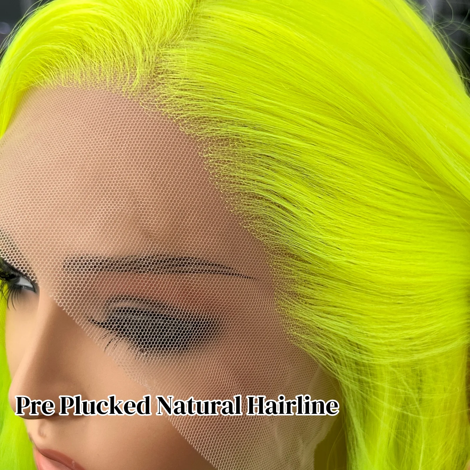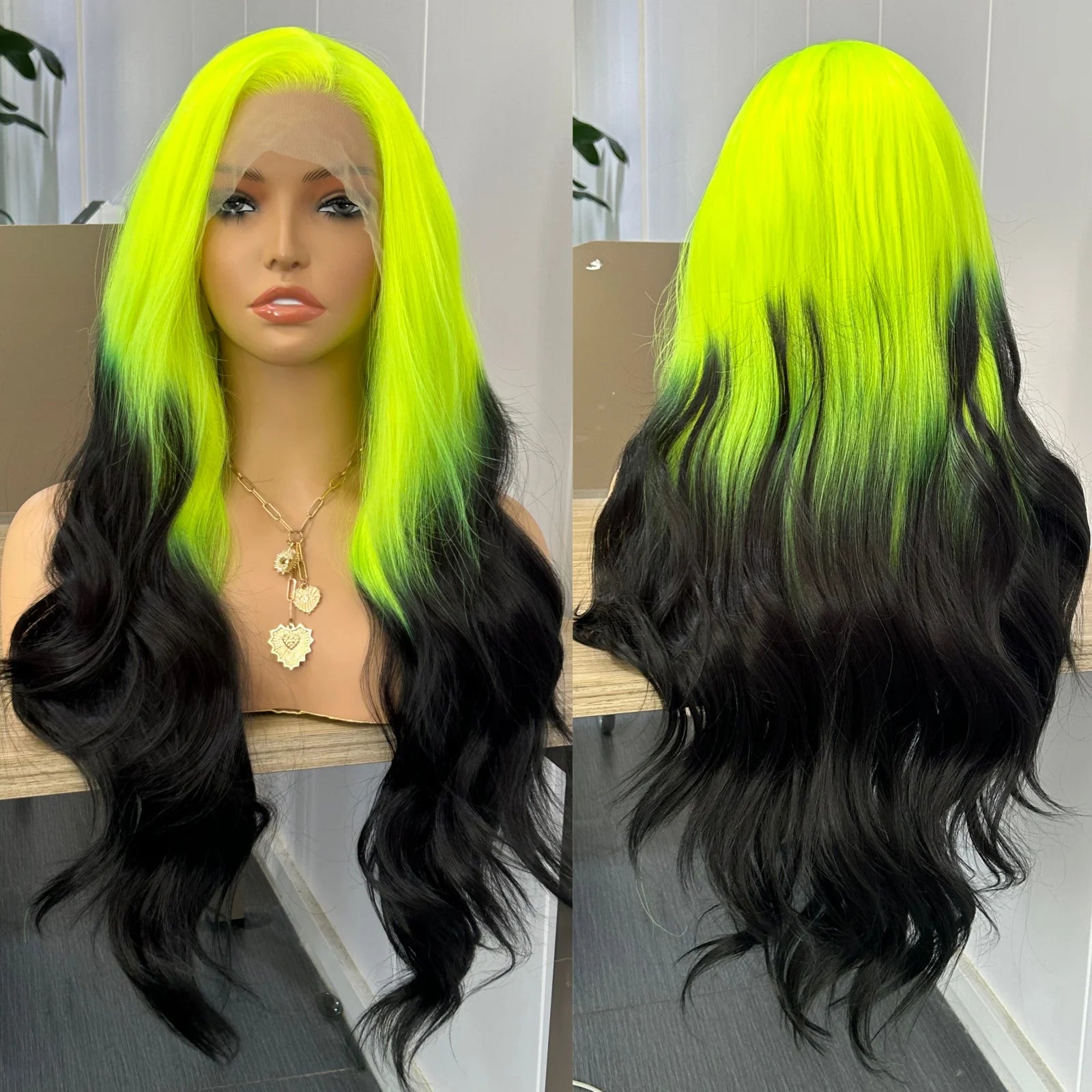 Long Wavy Body Wave Neon Green Black Ombre Wig Synthetic Free Part 13X4 Fluorescent Colored Wigs for Women Party Cosplay Costume