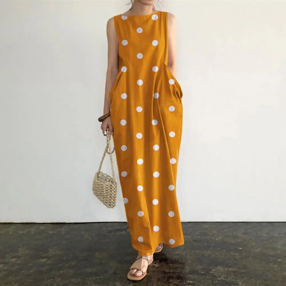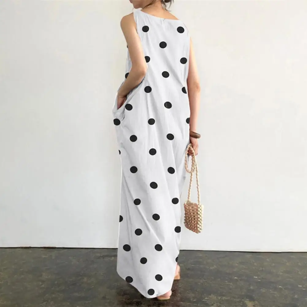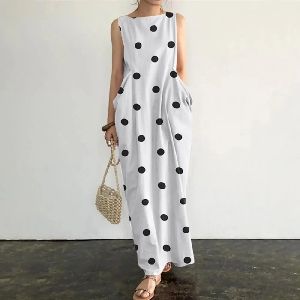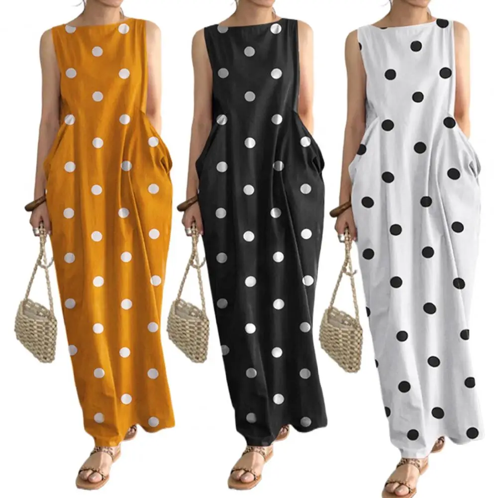 Loose Maxi Dress Summer Maxi Dress with Dot Print O Neck Big Pockets for Women Soft Ankle Length Beach