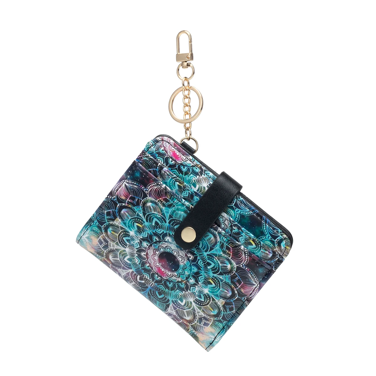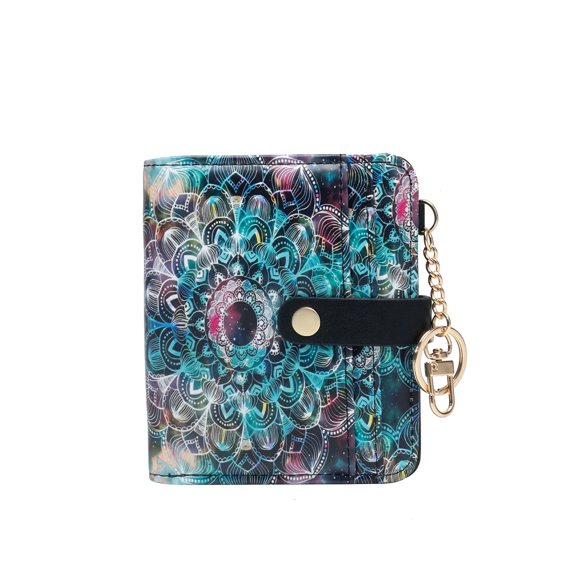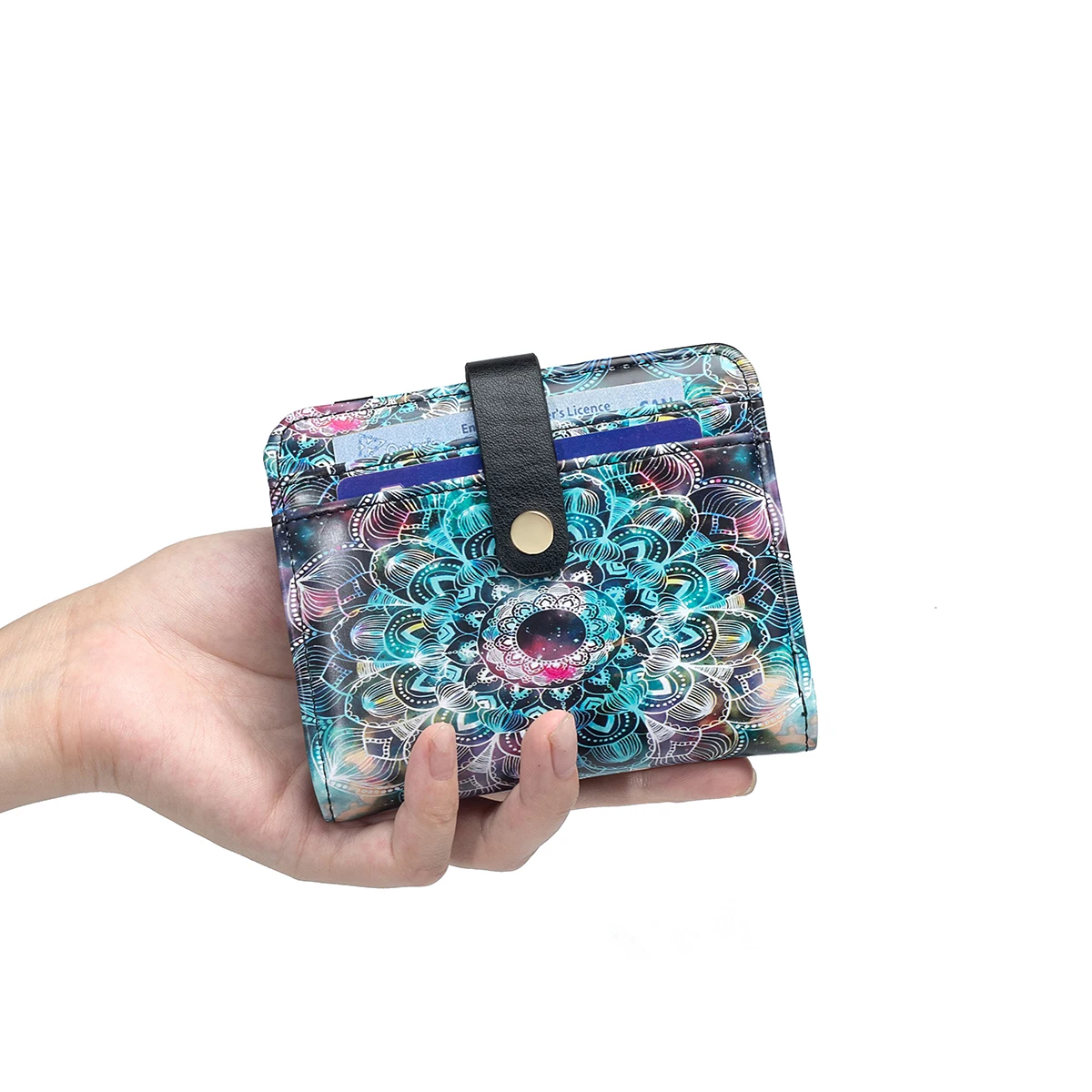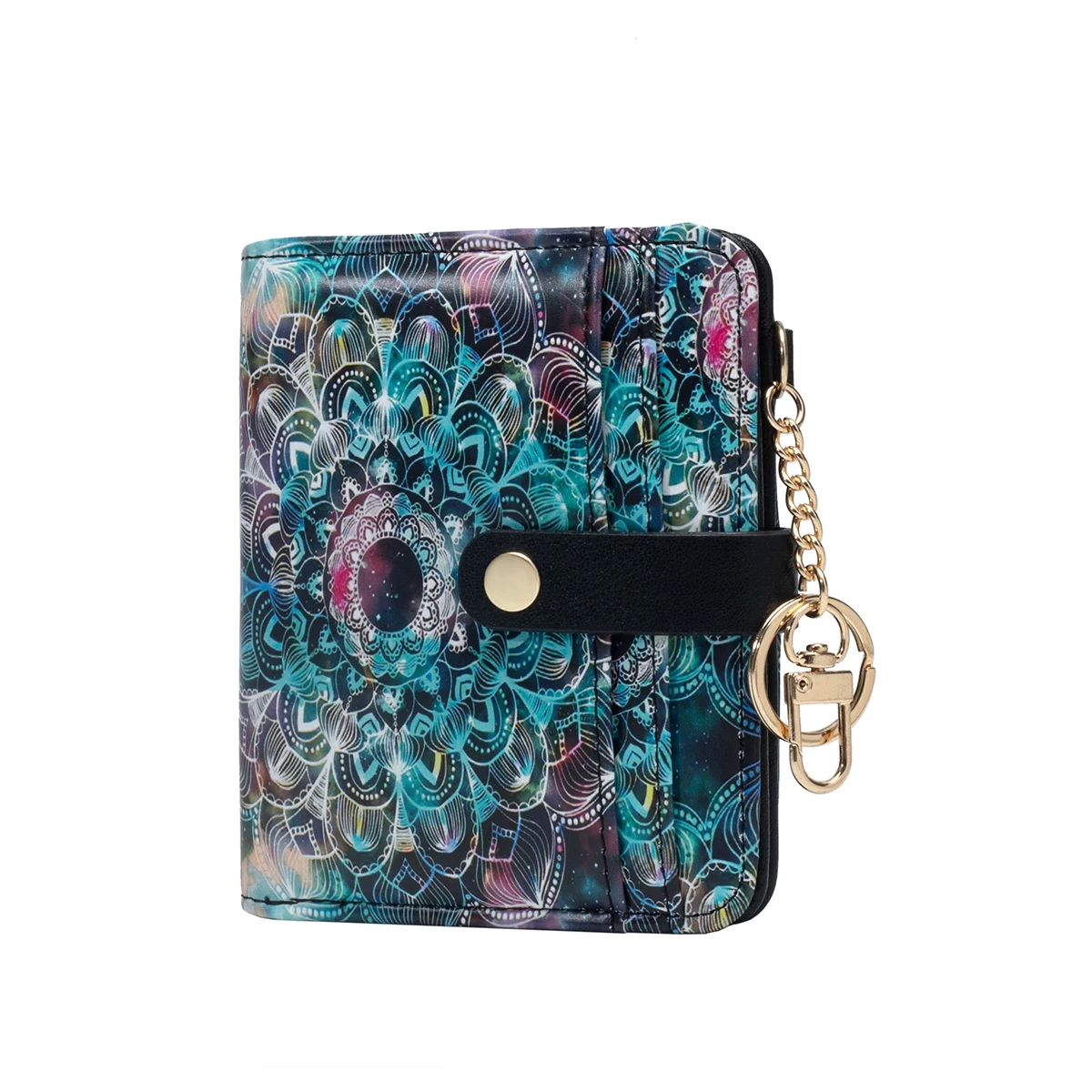 Mandala Flower Pattern Rfid Women's Wallet, Ultra-Thin and Compact Credit Card Wallet with Key Chain, Pu Leather Folding Zipper Coin Bag Id Card Transparent Window, Suitable for Women/Girls/Girls