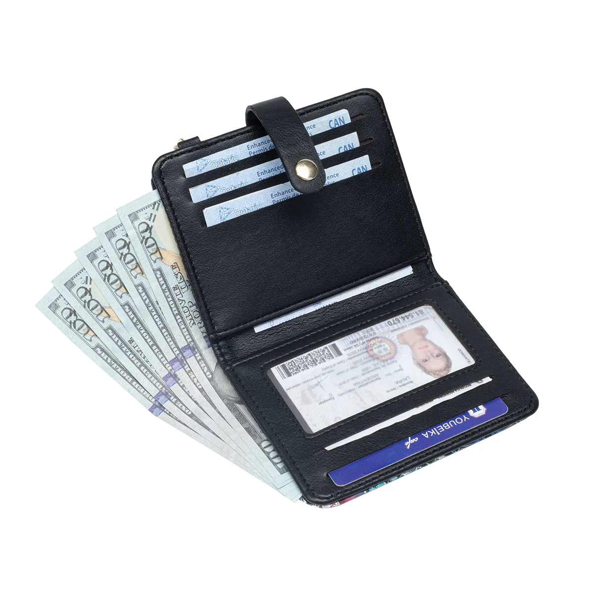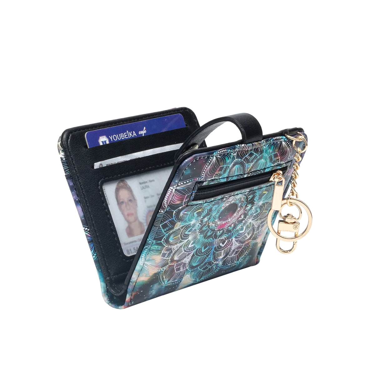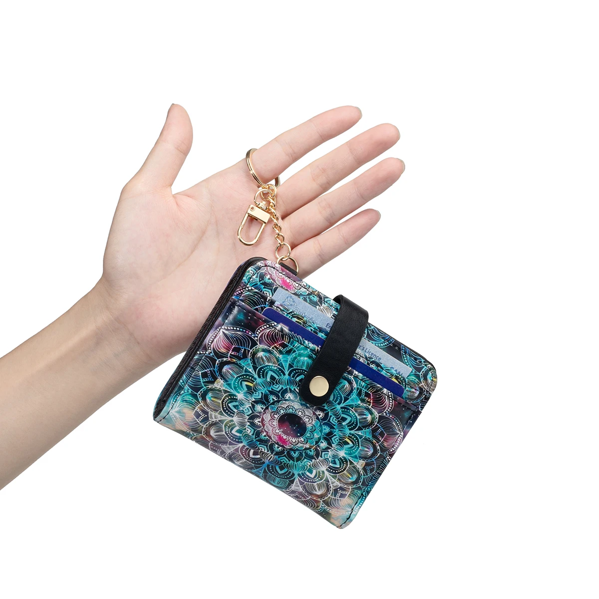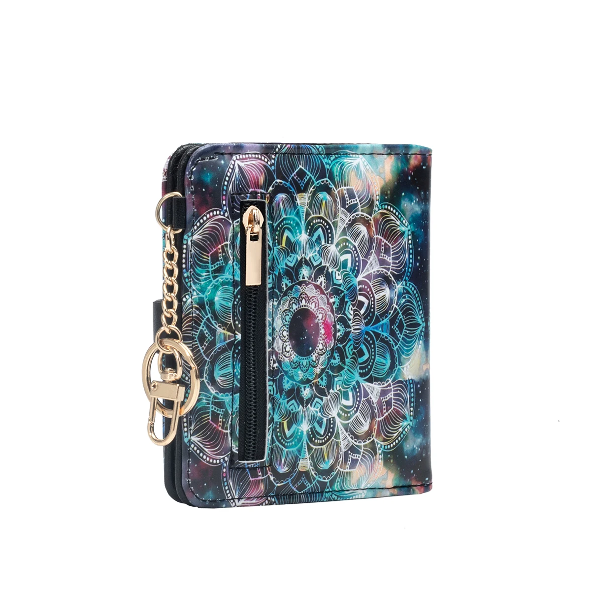 Mandala Flower Pattern Rfid Women's Wallet, Ultra-Thin and Compact Credit Card Wallet with Key Chain, Pu Leather Folding Zipper Coin Bag Id Card Transparent Window, Suitable for Women/Girls/Girls