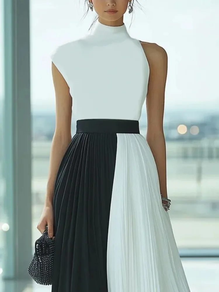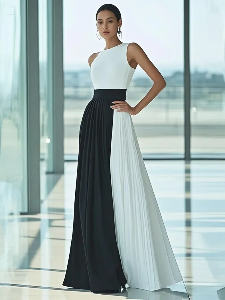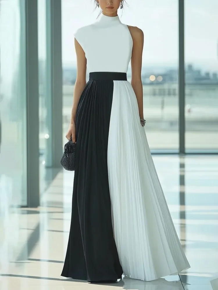 Missuoo 2025 Elegant Evening Dress for Women High Neck Sleeveless Pleated Maxi Dress Contrast Color High Waist Wedding Dresses