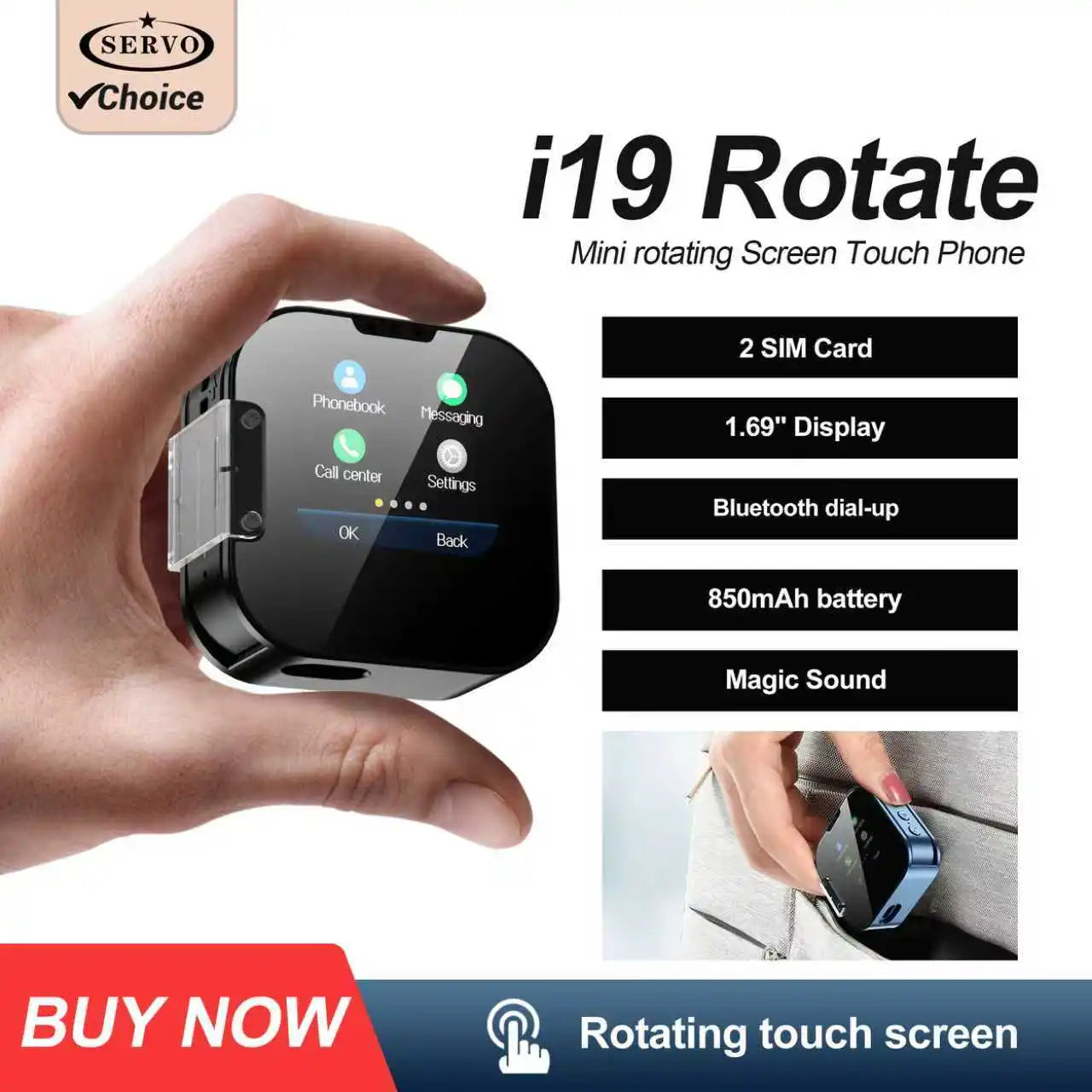NEW Upgrade SERVO i19 Rotate Touch Screen Phone Dual SIM Bluetooth Dial Sync Music Magic Voice Torch 1.69 Inch 2G Mini Cellphone