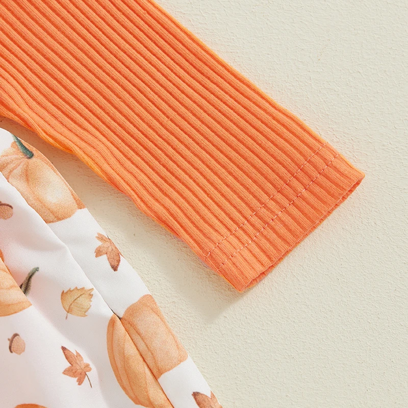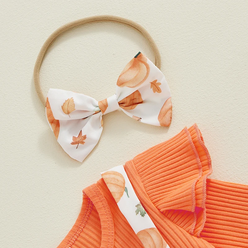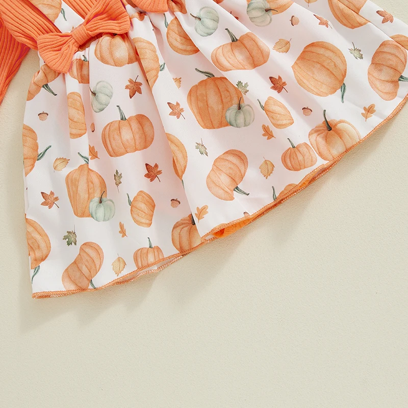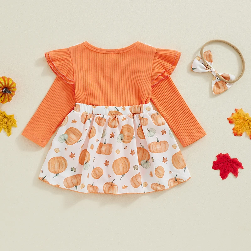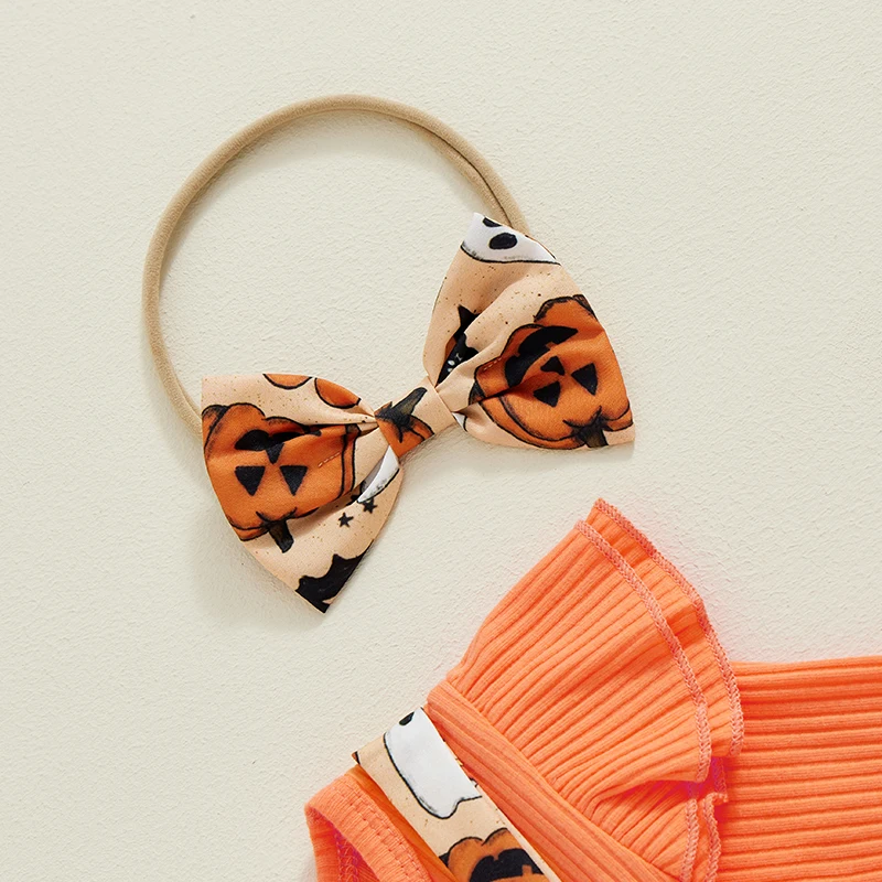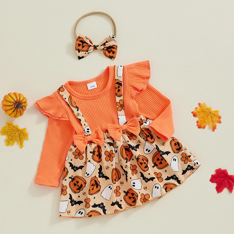 Newborn Baby Girl Halloween Clothes Outfit Pumpkin Ghost Print Long Sleeve Crew Neck Patchwork Romper Dress with Headband