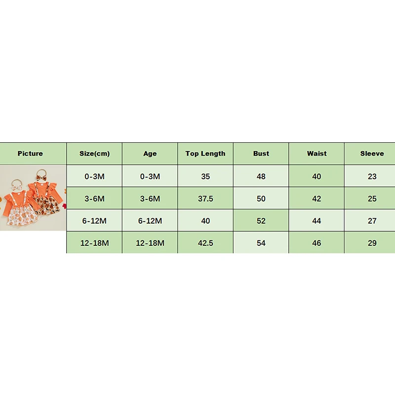 3-6M Length: 14.76 Bust: 19.68 Sleeve: 9.84 Waist: 16.54 Suggest Age: 3-6 Months