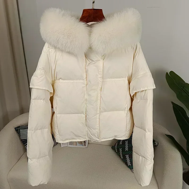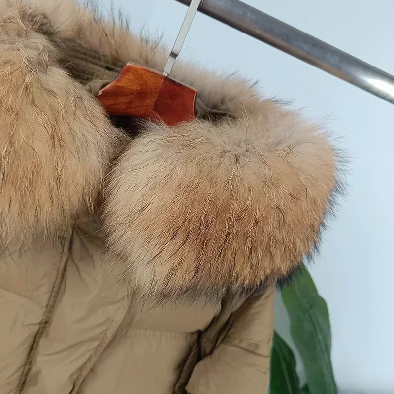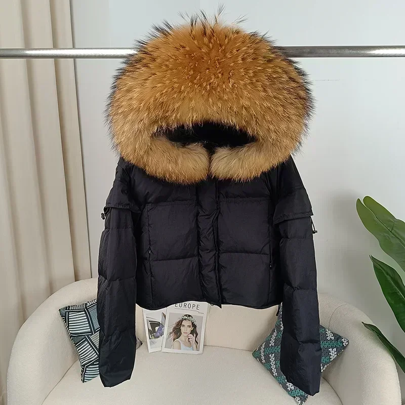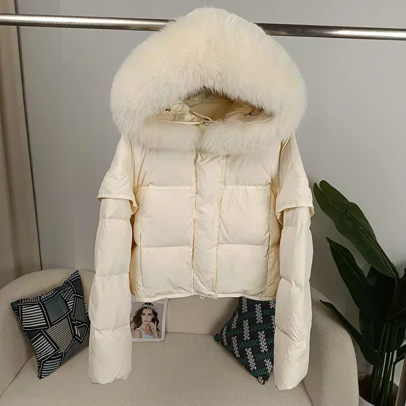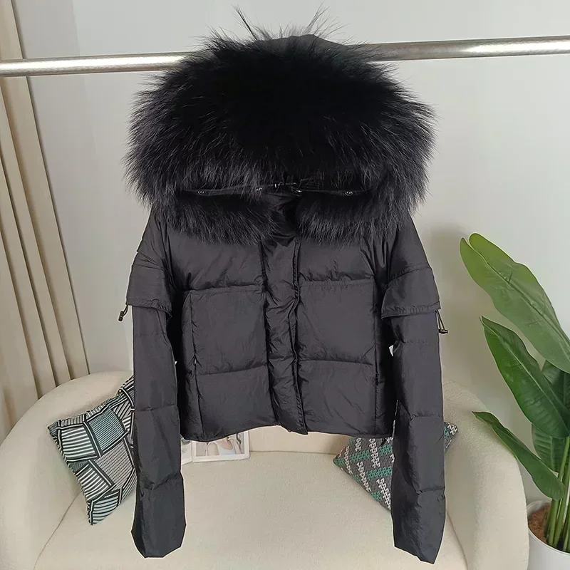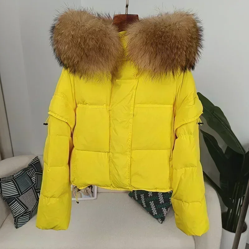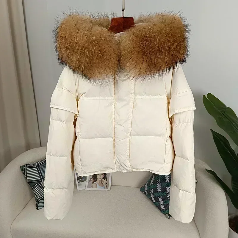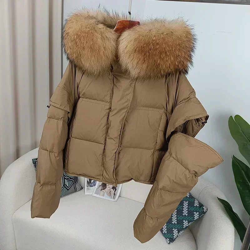 Outerwear Autumn Winter Women Hooded Fashionable Streetwear Detachable Sleeve Real Raccoon Fur Collar Jacket Duck Down Loose