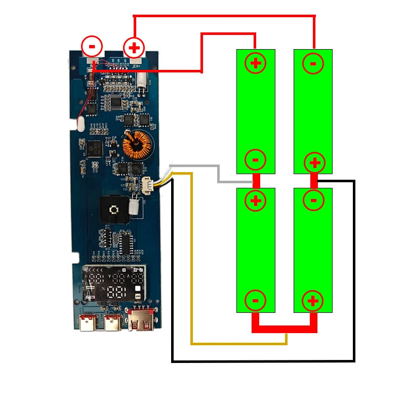 The battery needs to be connected in series circuit . Connect the positive pole of the battery to the "B+"end on the back of the motherboard, and the negative pole of the battery to the "B -" end on the back of the motherboard.