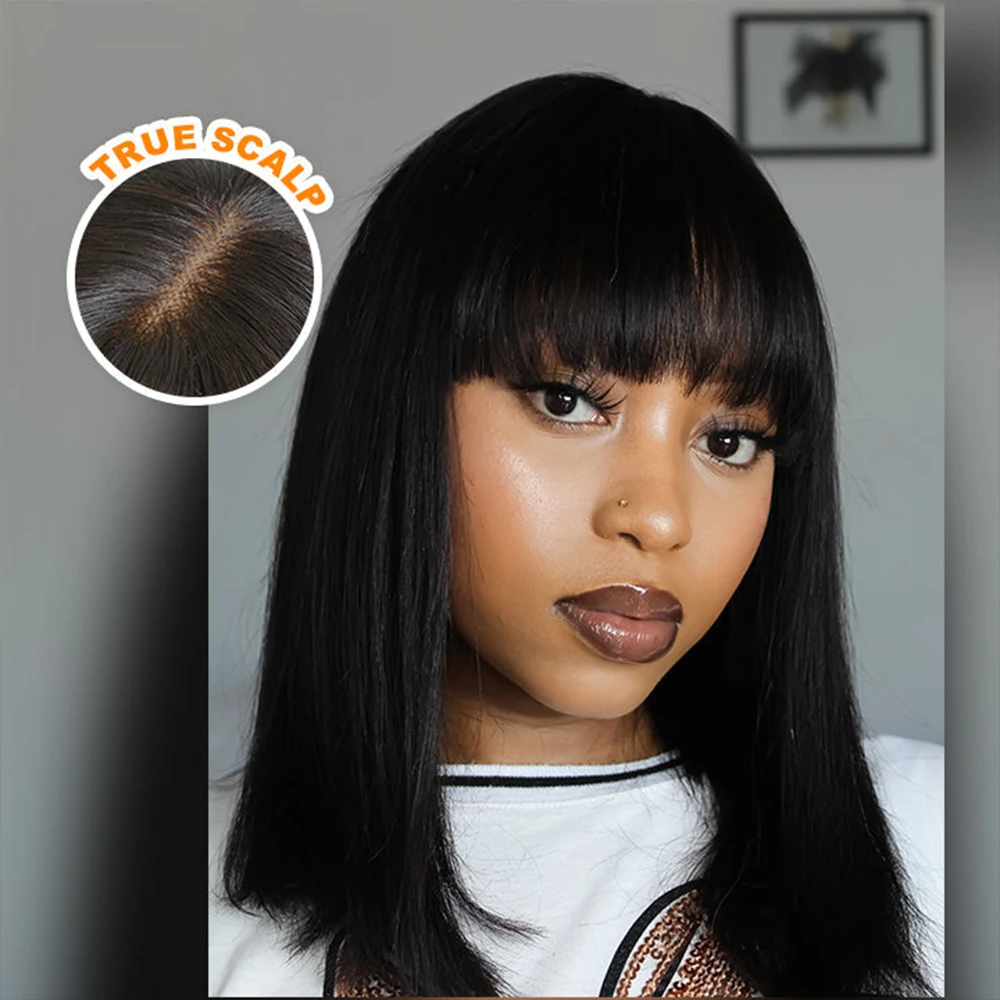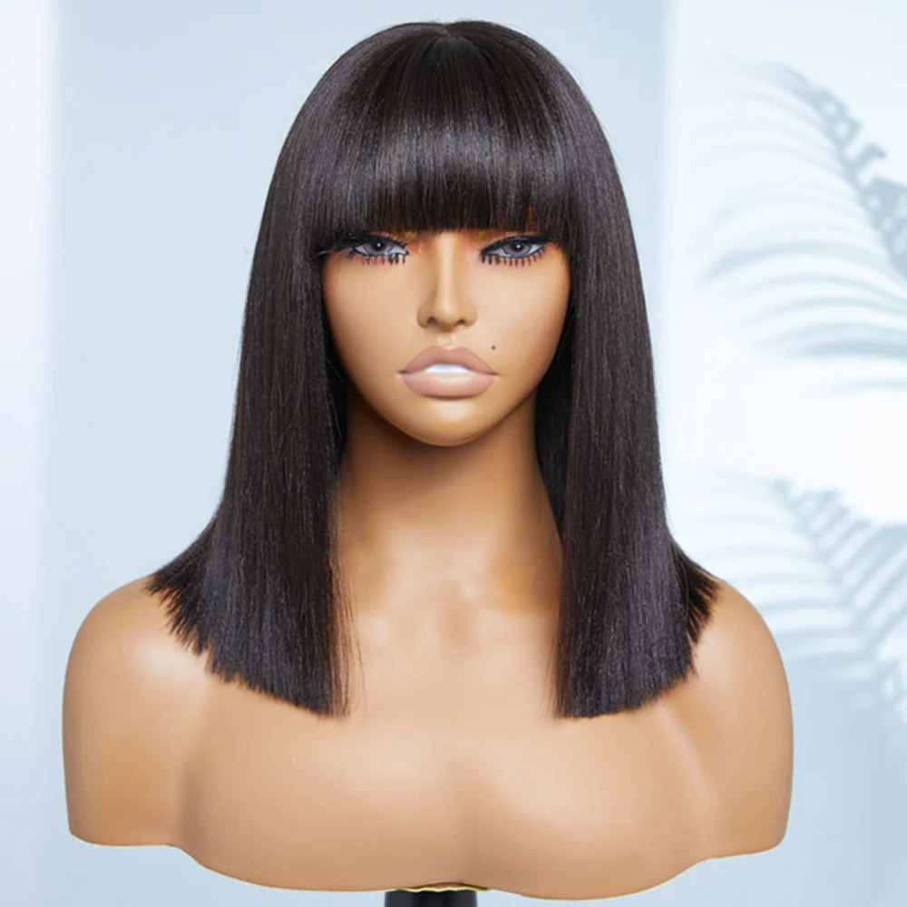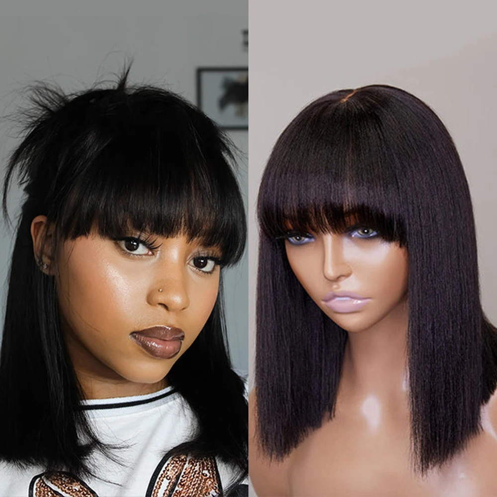 Ready to Go Yaki Straight Short Bob Wig With Bangs 2x1 Lace Glueless Virgin Remy Human Hair Undetectable Lace Blunt Cut Bob Wig