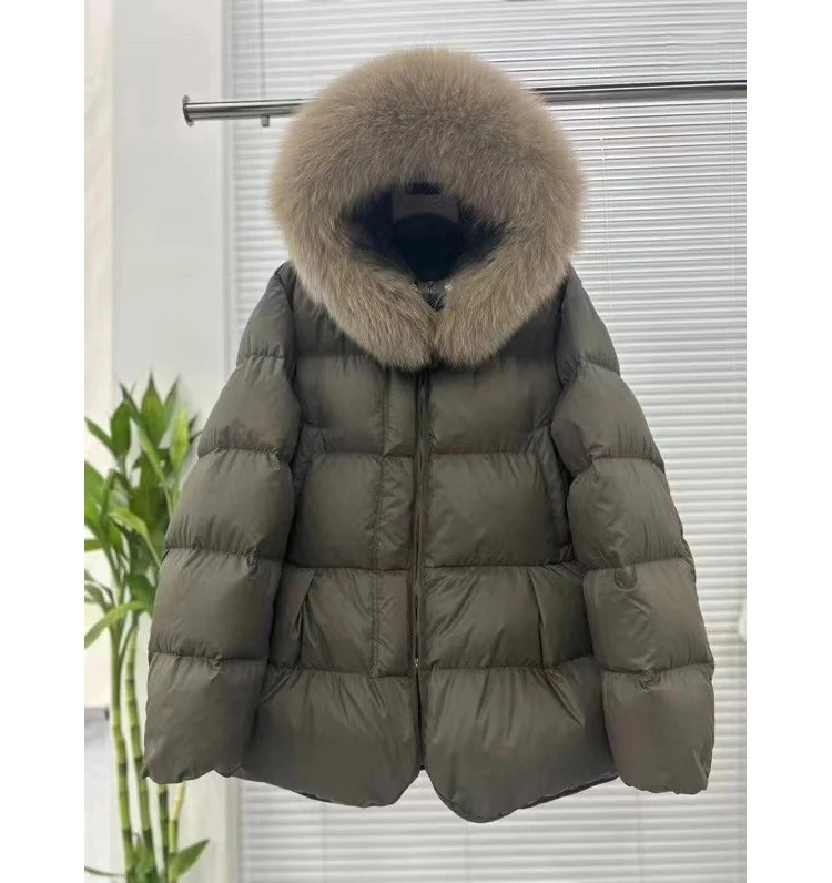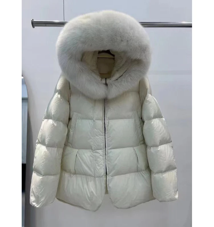 Schinteon Women 100% Real Fox Fur Collar White Duck Down Jacket with Hood Autumn Winter Warm Casual A-lined Warm Outwear Cape