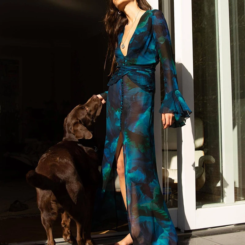 Show Style Floral Print Maxi Slim Dress Women Luxury Deep V-Neck Chiffon Party Dress 2025 Spring Elegant Long Sleeve Slit Dress