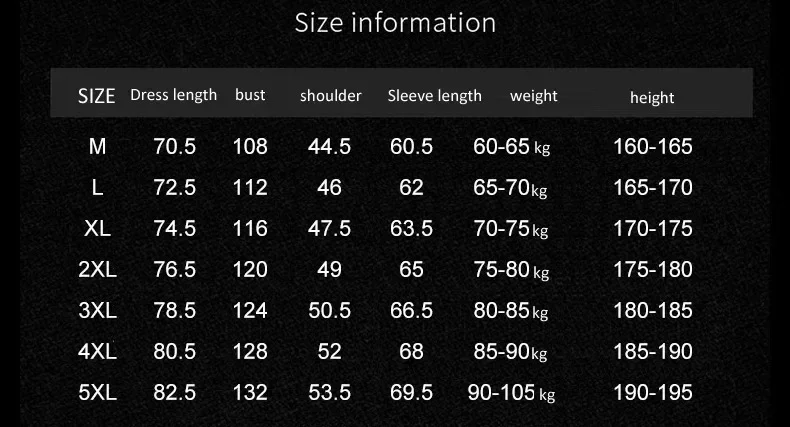 size_info: {"sizeInfoList":[{"length":{"cm":"70.5","inch":"27.76"},"size":"M","vid":-1},{"length":{"cm":"72.5","inch":"28.54"},"size":"L","vid":-2},{"length":{"cm":"74.5","inch":"29.33"},"size":"XL","vid":-3},{"length":{"cm":"76.5","inch":"30.12"},"size":"XXL","vid":-4},{"length":{"cm":"78.5","inch":"30.91"},"size":"XXXL","vid":-5},{"length":{"cm":"80.5","inch":"31.69"},"size":"4XL","vid":-6},{"length":{"cm":"82.5","inch":"32.48"},"size":"5XL","vid":-7}]}