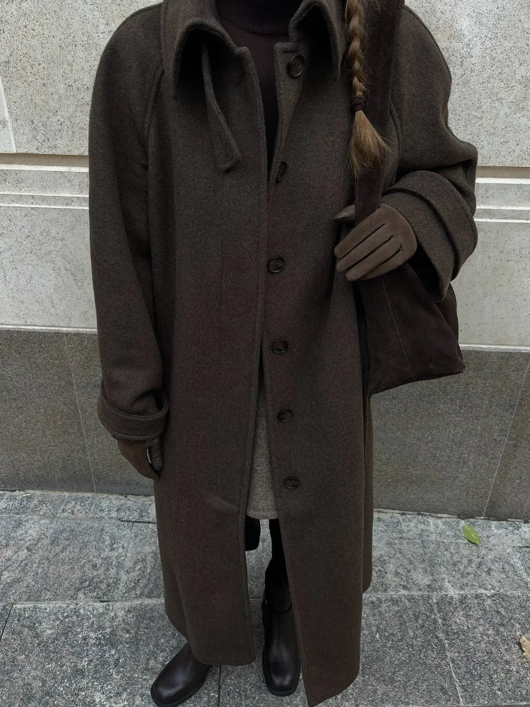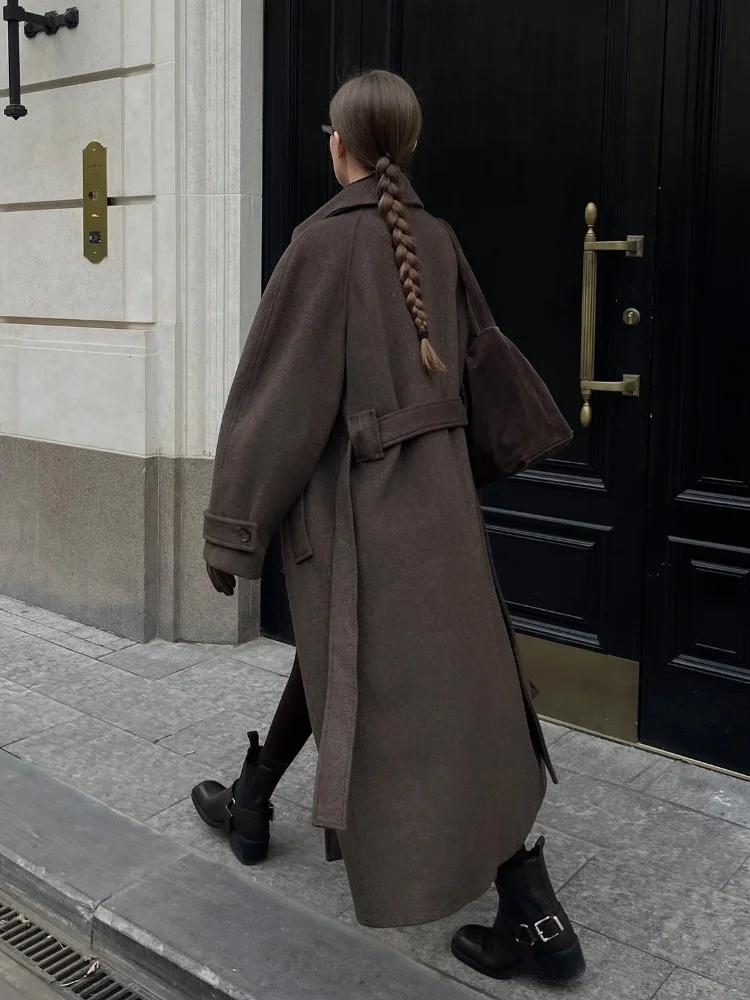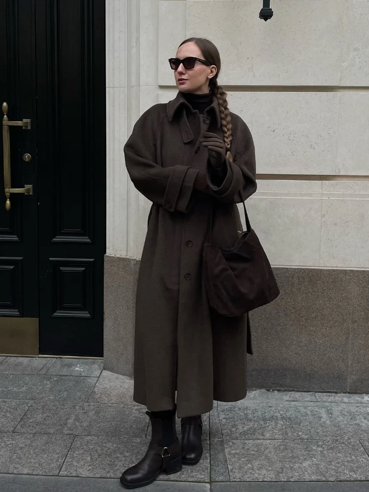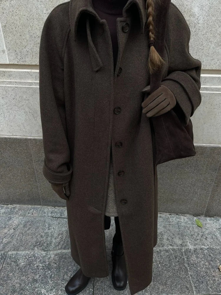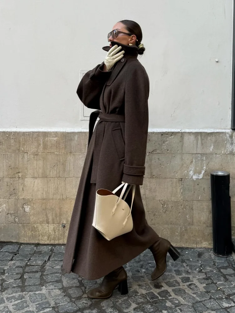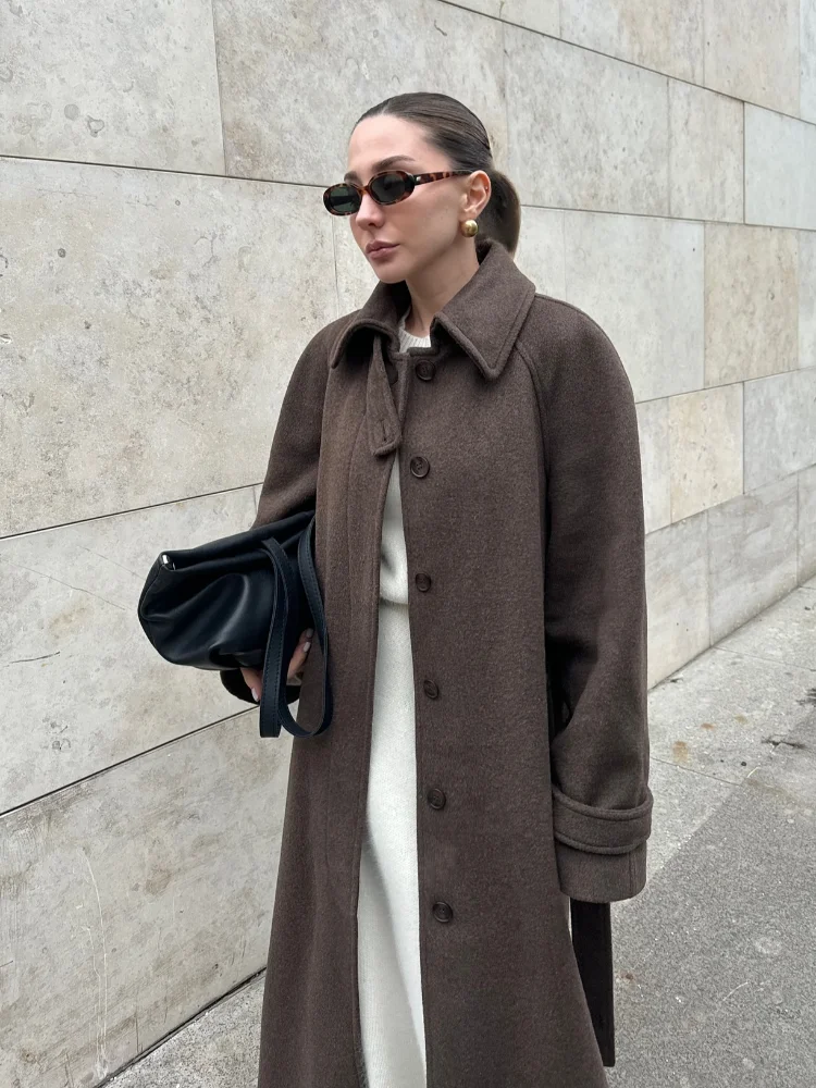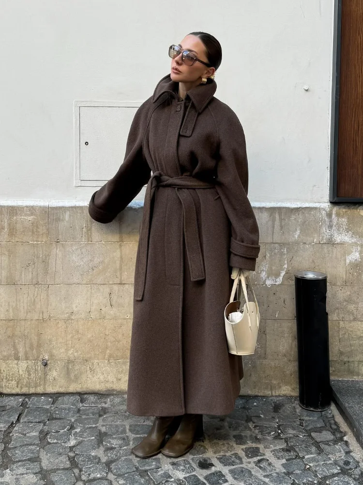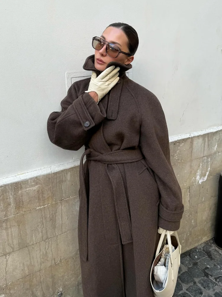 Stand Collar Single Breasted Woolen Lace Up Long Overcoat Women Elegant Full Sleeves Button Pockets Coats New Autumn Winter Tops