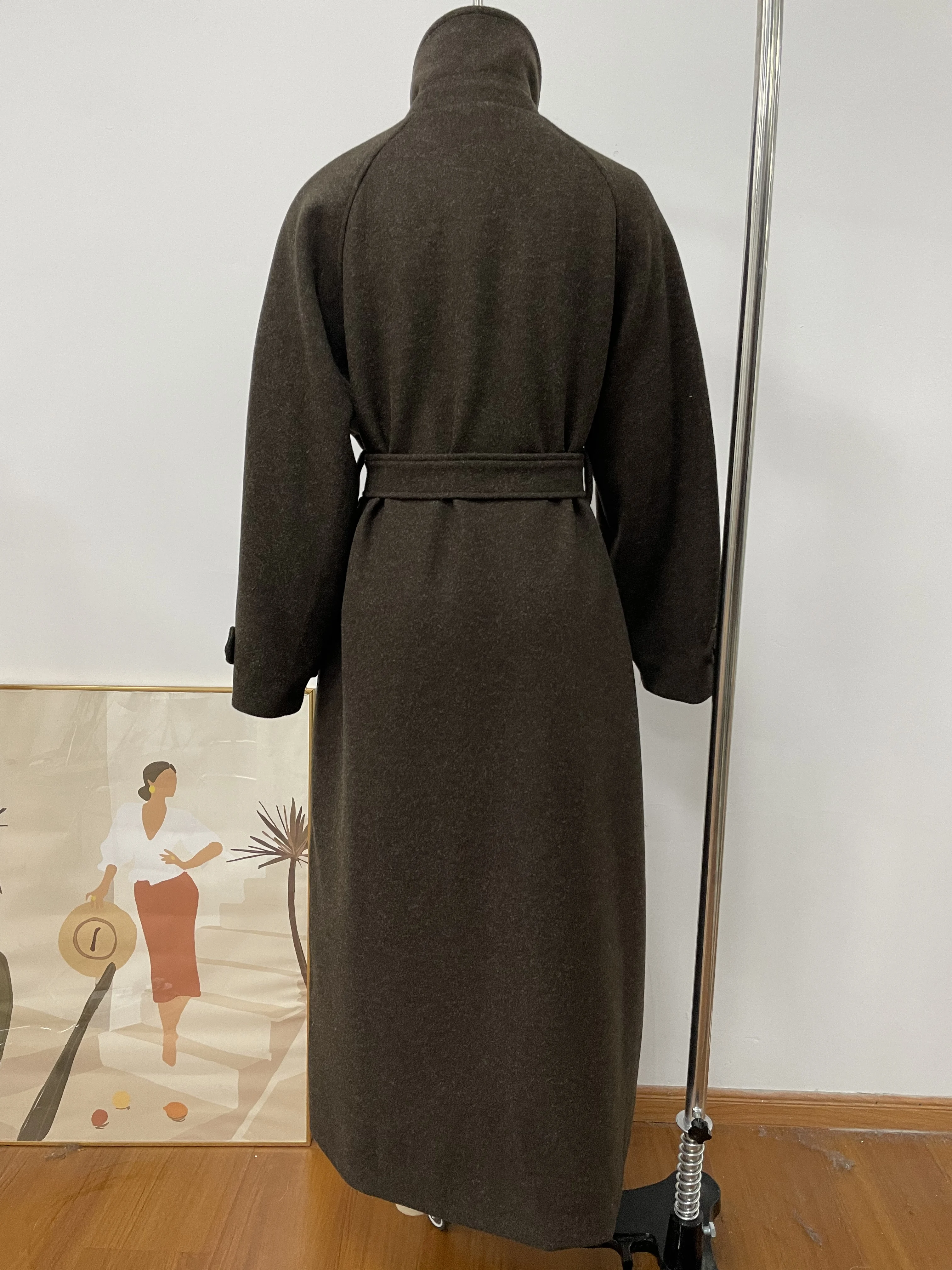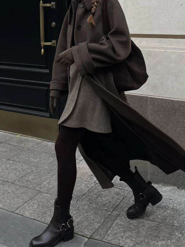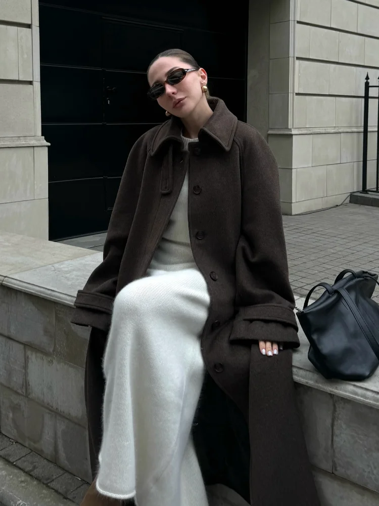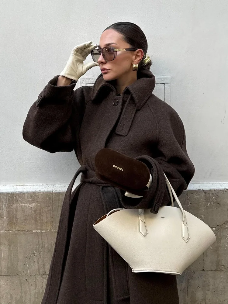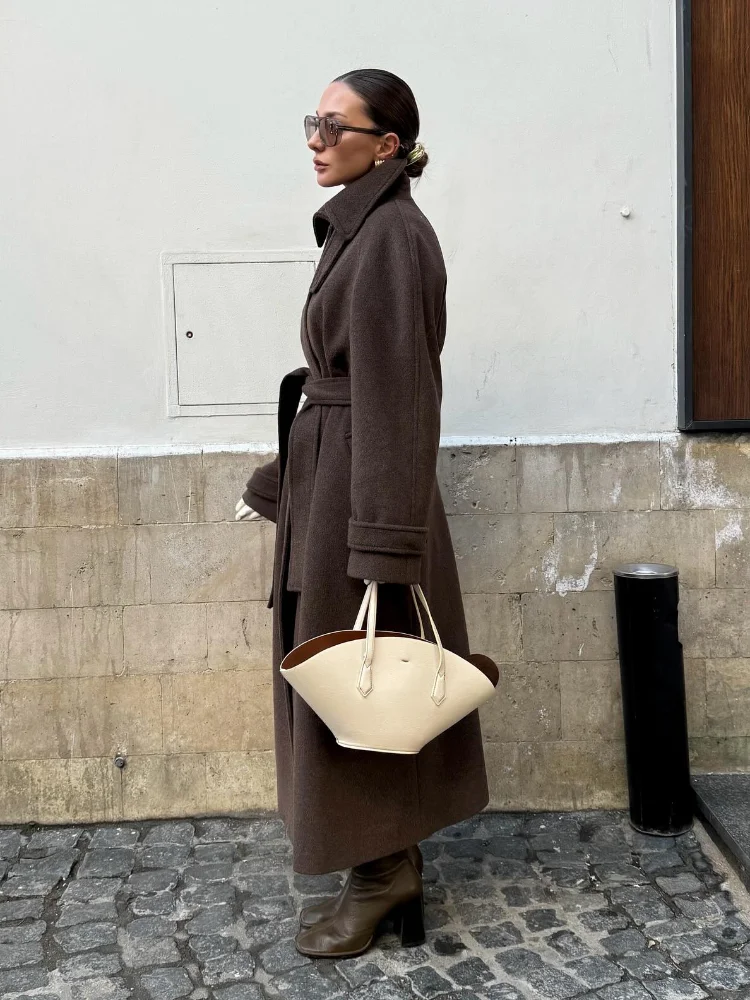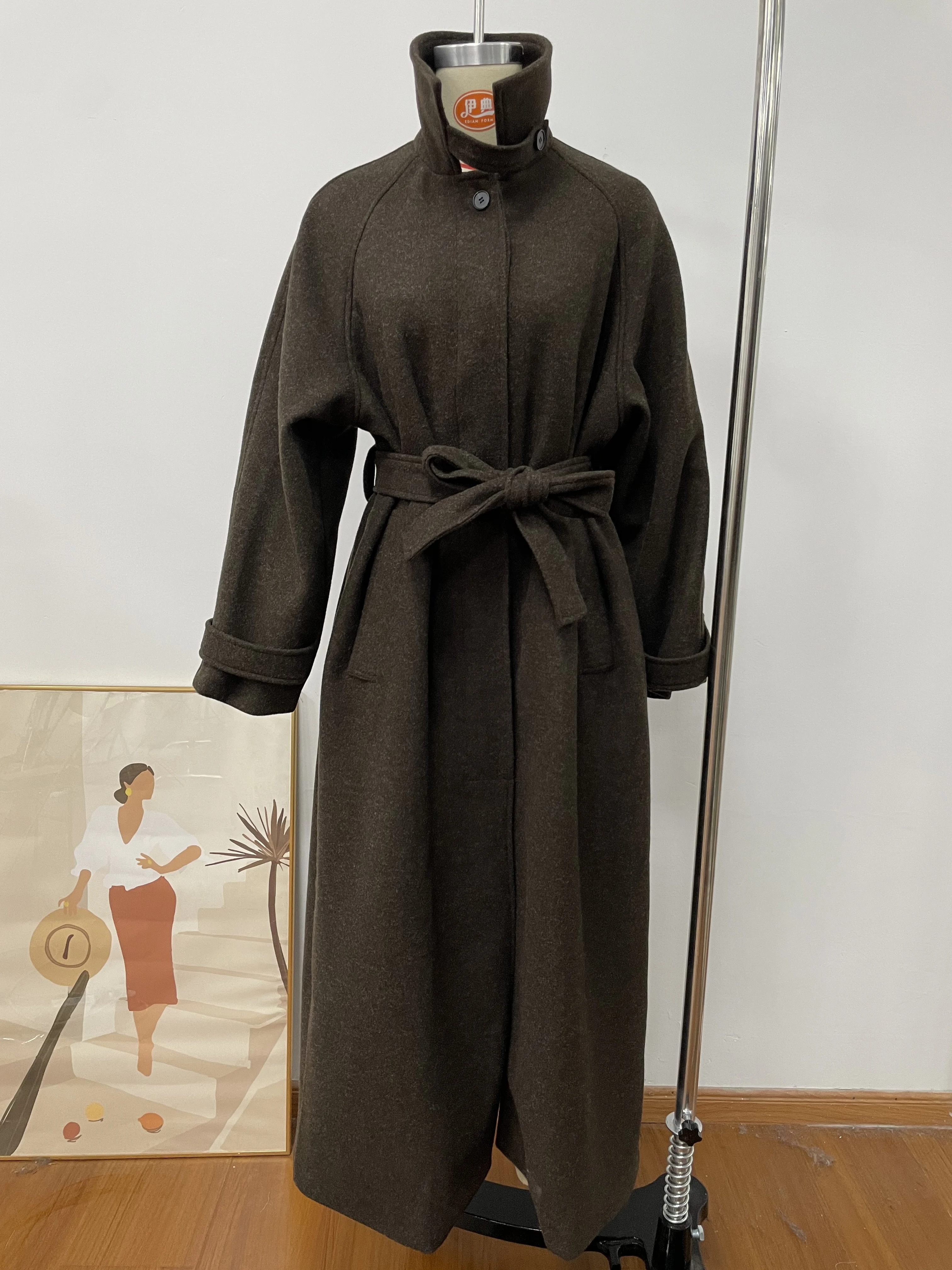 Stand Collar Single Breasted Woolen Lace Up Long Overcoat Women Elegant Full Sleeves Button Pockets Coats New Autumn Winter Tops