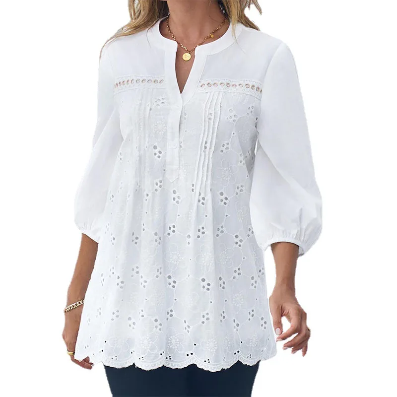Summer Clothes for Women All-match White V-Neck Hollow Out Pullover Nine Points Sleeve Blouse Lace Slim Elegant Shirt Tunic