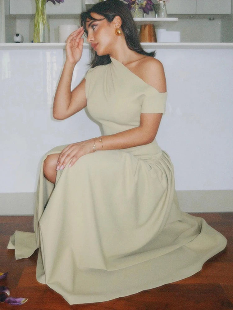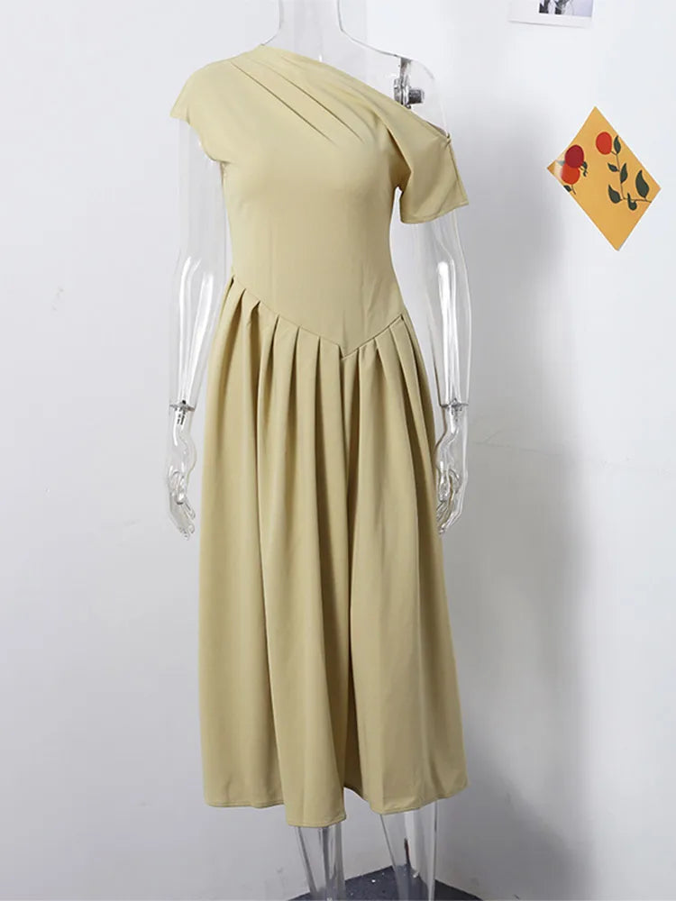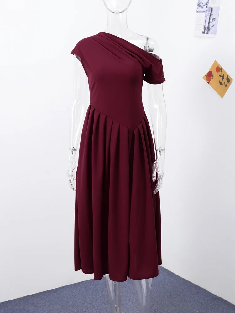 1.Ingenious Tailoring:The single-sided off-shoulder design and waist pleats are meticulously crafted, precisely contouring to body curves for an elegant silhouette.