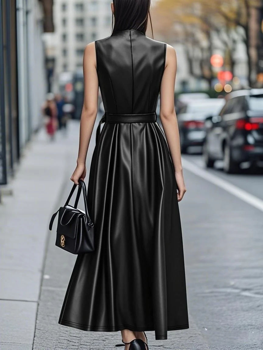 Summer Maxi Dresses for Women Sexy V-neck Black PU Leather Dress Women Sleeveless Slim Fit Elegant A-Line Dress With Blet