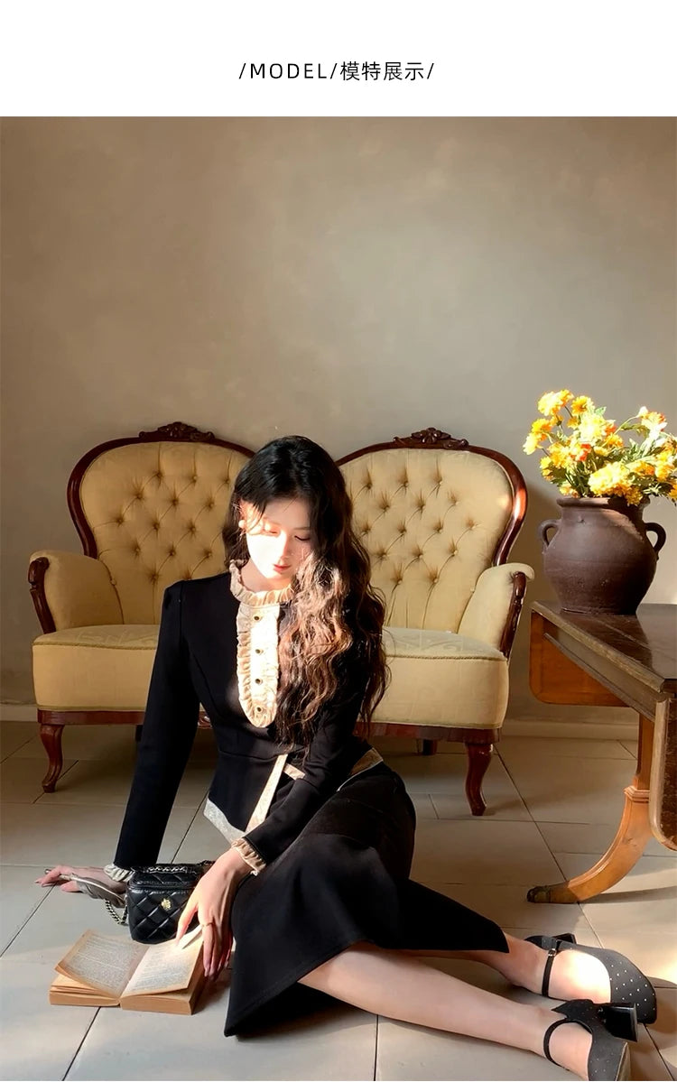 Women Clothes Black Vintage Outfits Elegant Ruffle O-Neck Tops Shirt Blouse And High Waist Midi Skirt Mujer 2 Pieces Set Formal