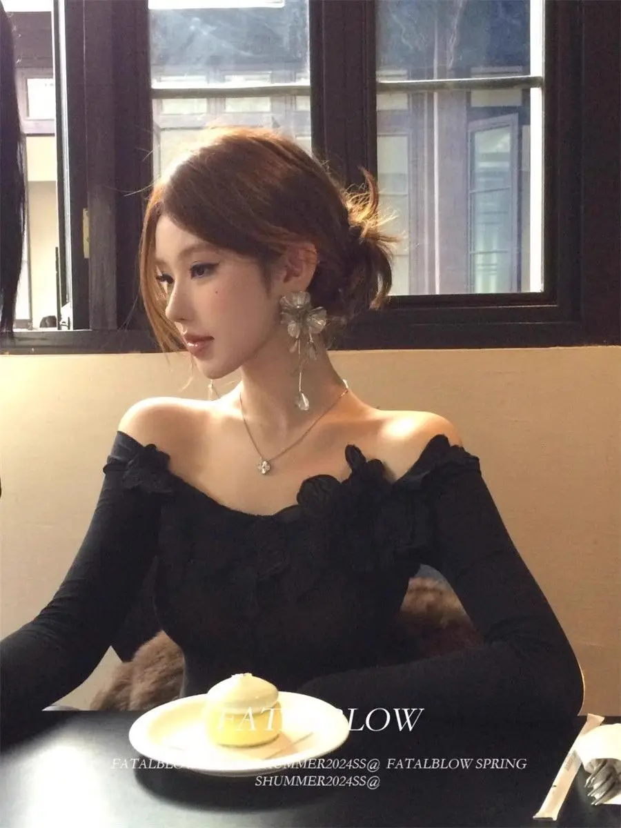 Women Clothes Spring Autumn Fashion Simplicity Solid Color Slash Neck Ladies Trend Pure Desire Wind Long Sleeve Appear Thin Tops
