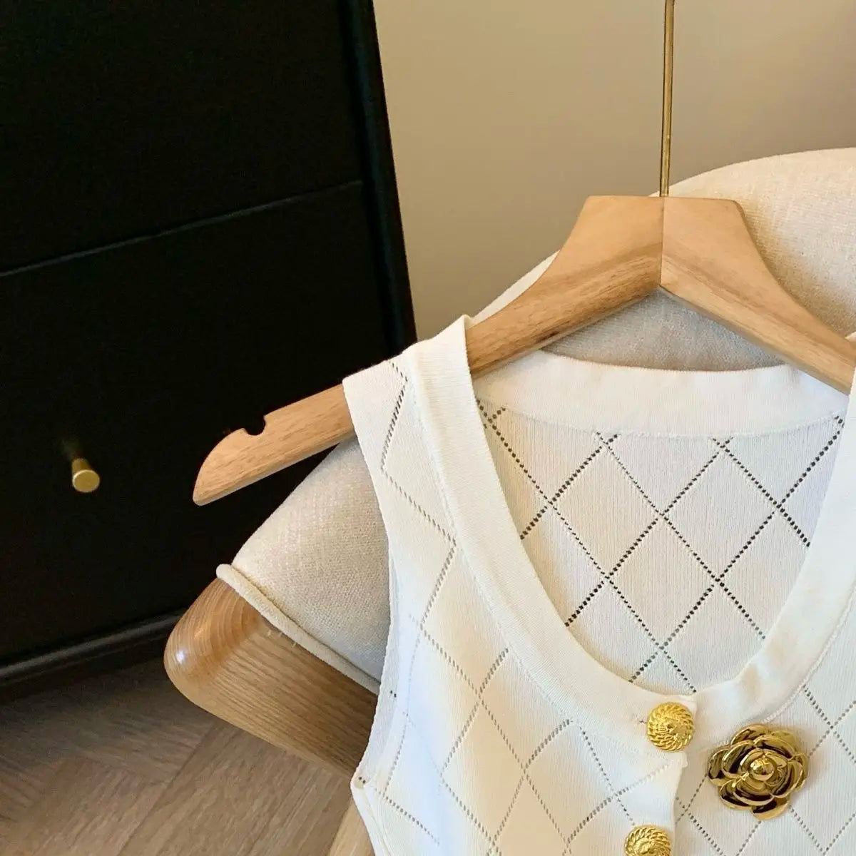 Women Clothes Stylish Vintage Elegant Luxury Chic Hollow Button Knitted Vest Summer V Neck Sleeveless Black White Slim Tank Tops
