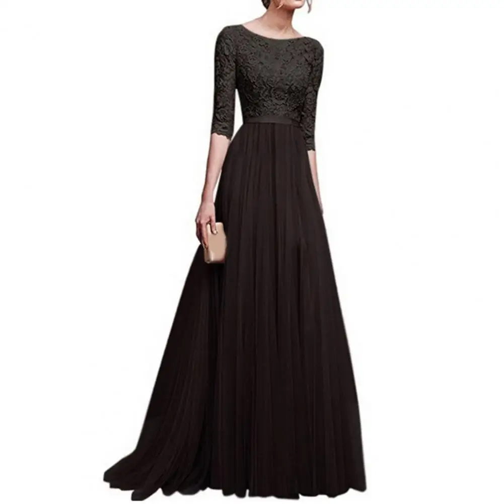 Women Maxi Dress Elegant Lace Flower Embroidered Maxi Evening Dress for Women Round Neck Half Sleeve Tight Waist Floor Length