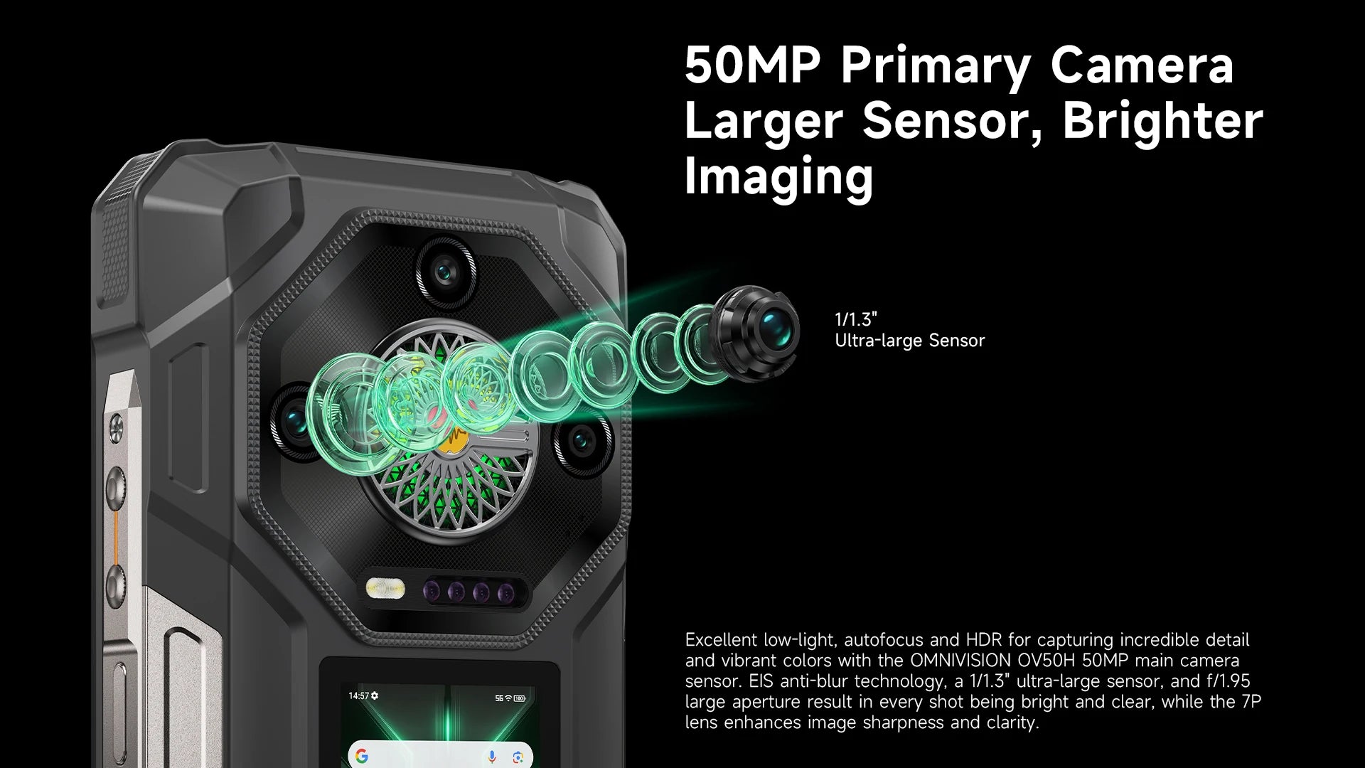 Excellent low-light, autofocus and HDR for capturing incredible detail and vibrant colors with the OMNIVISION OV50H 50MP main camera sensor. EIS anti-blur technology, a 1/1.3" ultra-large sensor, and f/1.95 large aperture result in every shot being bright and clear, while the 7P lens enhances image sharpness and clarity.