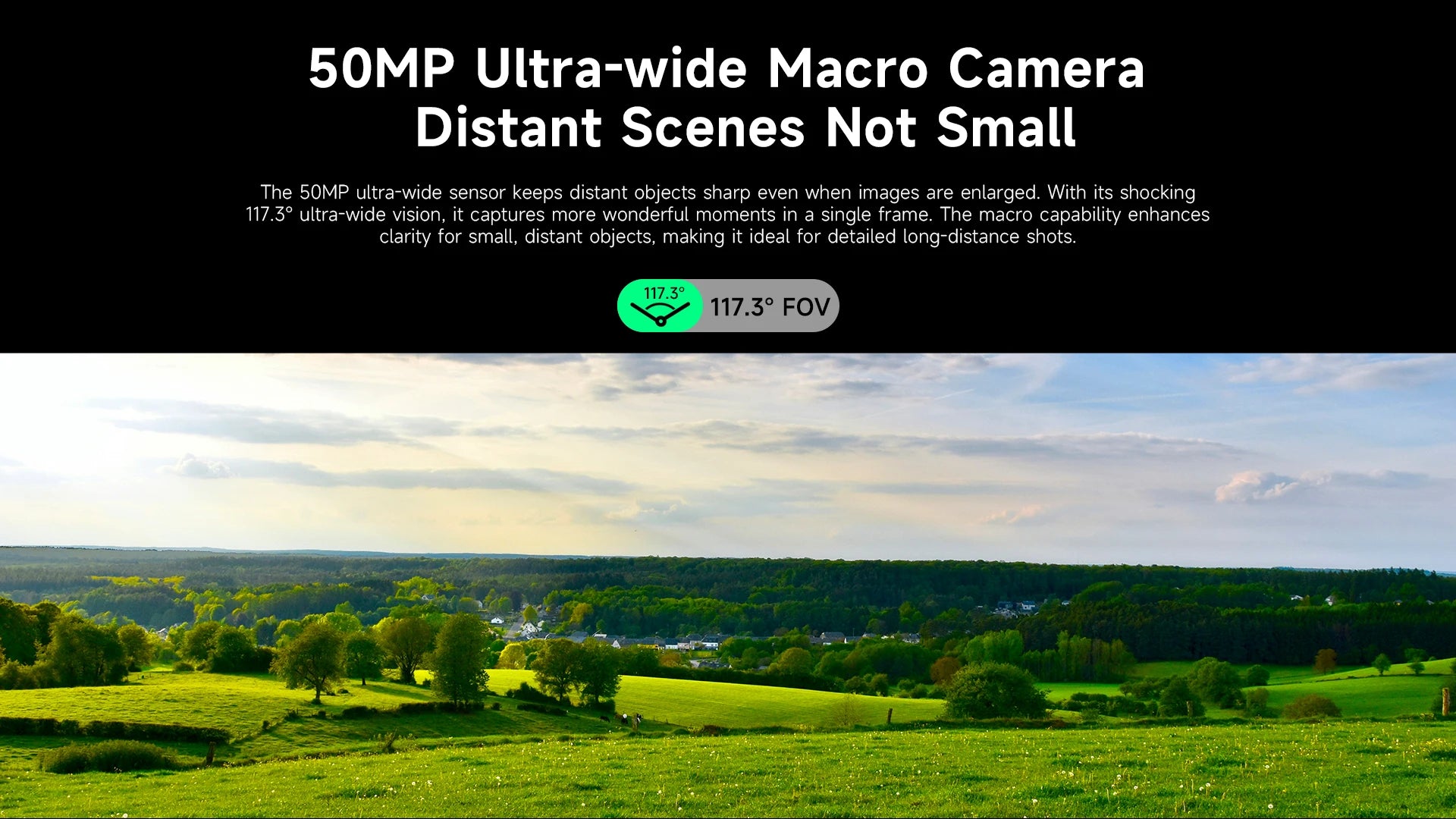 The 50MP ultra-wide sensor keeps distant objects sharp even when images are enlarged. With its shocking 117.3° ultra-wide vision, it captures more wonderful moments in a single frame. The macro capability enhances clarity for small, distant objects, making it ideal for detailed long-distance shots.