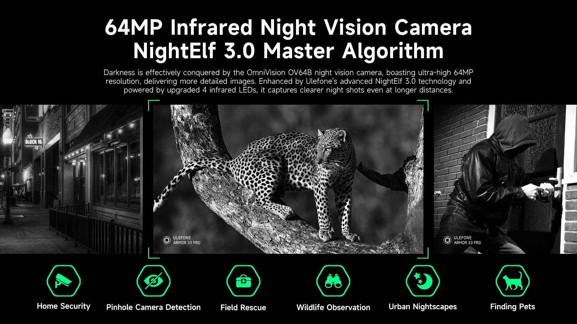 Darkness is effectively conquered by the OmniVision OV64B night vision camera, boasting ultra-high 64MP resolution, delivering more detailed images. Enhanced by Ulefone's advanced NightElf 3.0 technology and powered by upgraded 4 infrared LEDs, it captures clearer night shots even at longer distances.